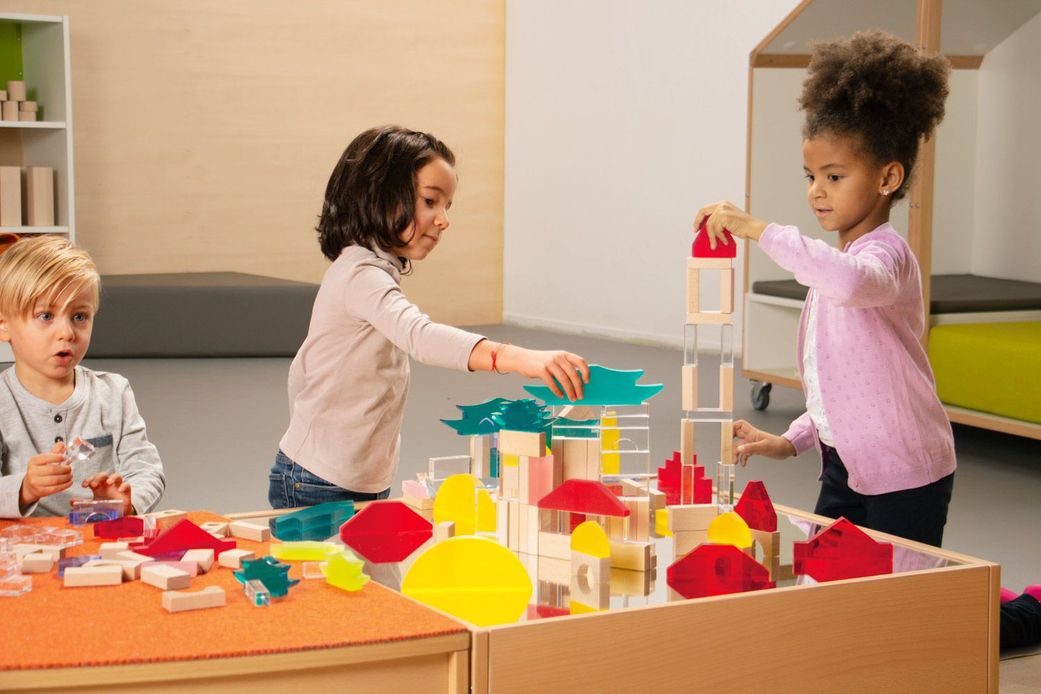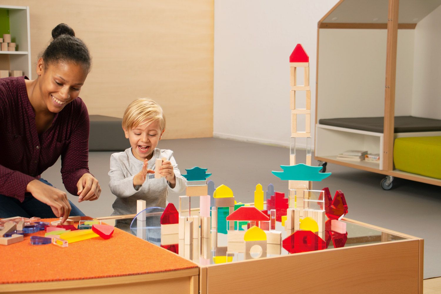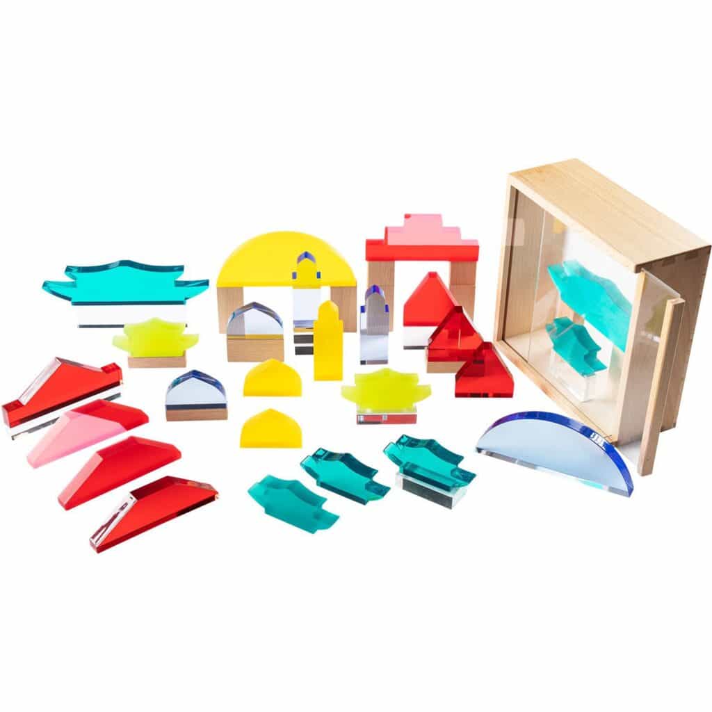 - Fascinierende Farb- und Lichtspiele: Die Kombination aus Acrylglas und Holz erzeugt bei Lichteinfall wunderschöne Farb- und Formenspiele. Kinder können die Ästhetik ihrer Bauwerke entdecken und beeindruckende visuelle Effekte erleben, die ihre Fantasie anregen.