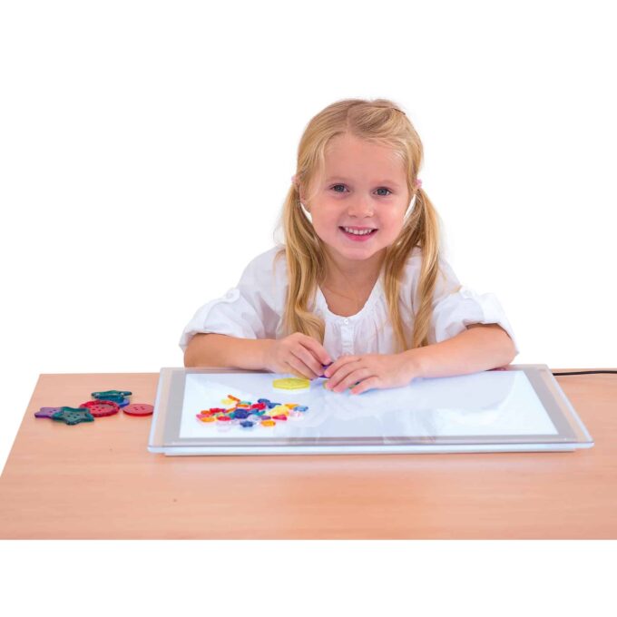 Der Lichttisch ist leicht und einfach zu reinigen, was den Einsatz im Klassenzimmer, in der Kita oder zu Hause erleichtert. Zudem sorgt die Verriegelungsfunktion am Ein-Aus-Schalter dafür, dass das Panel nicht versehentlich ausgeschaltet wird.