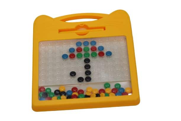 Mit dem Magnetstift des Magnetboards können die bunten Chips zu immer neuen Bildern angeordnet werden. Das Set enthält 12 doppelseitige Vorlagekarten, die als Inspiration dienen. Mit dem Magnetstift können Kinder ihrer Kreativität freien Lauf lassen und eigene Muster und Bilder entwerfen.