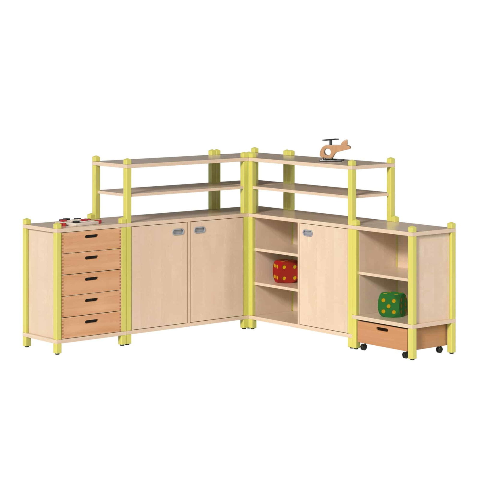 - Vielfältige Stauraumlösungen in einem System: Diese Eckkombination ist ein wahres Multitalent. Sie vereint offene Regale für schnellen Zugriff, Schränke mit Türen für verdeckte Aufbewahrung, hochwertige Massivholzschübe für Kleinteile und einen mobilen Rollkasten für flexibles Spielzeug-Management.