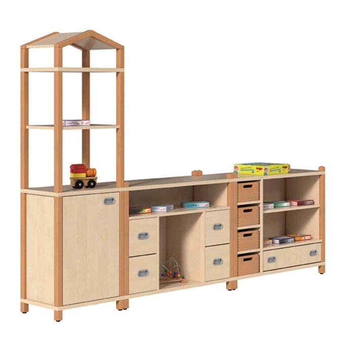 - Praktische Materialkästen: Vier robuste Materialkästen sind im System integriert und eignen sich ideal für größeres Spielzeug, Bausteine oder thematische Lernmaterialien. Sie können einfach entnommen werden und fördern so das selbstständige Aufräumen.