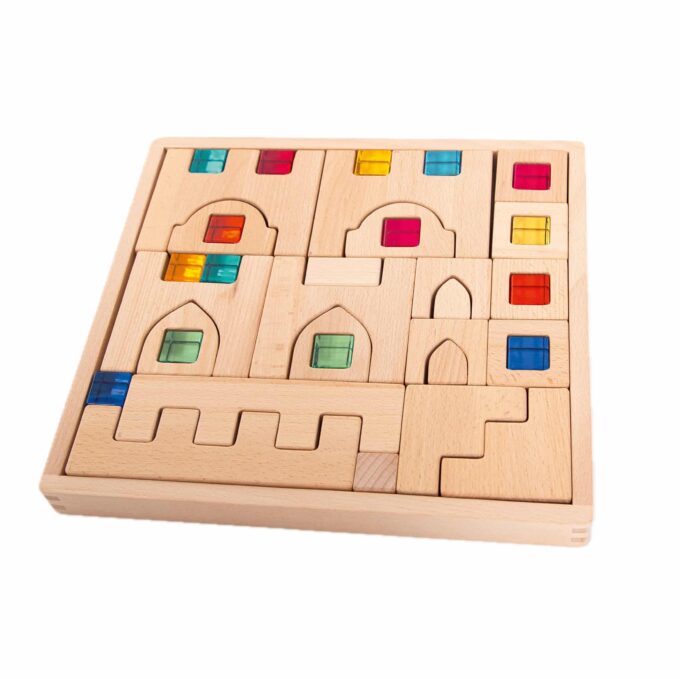 - Inhalt: 22 Holzbausteine + 15 Acrylbausteine