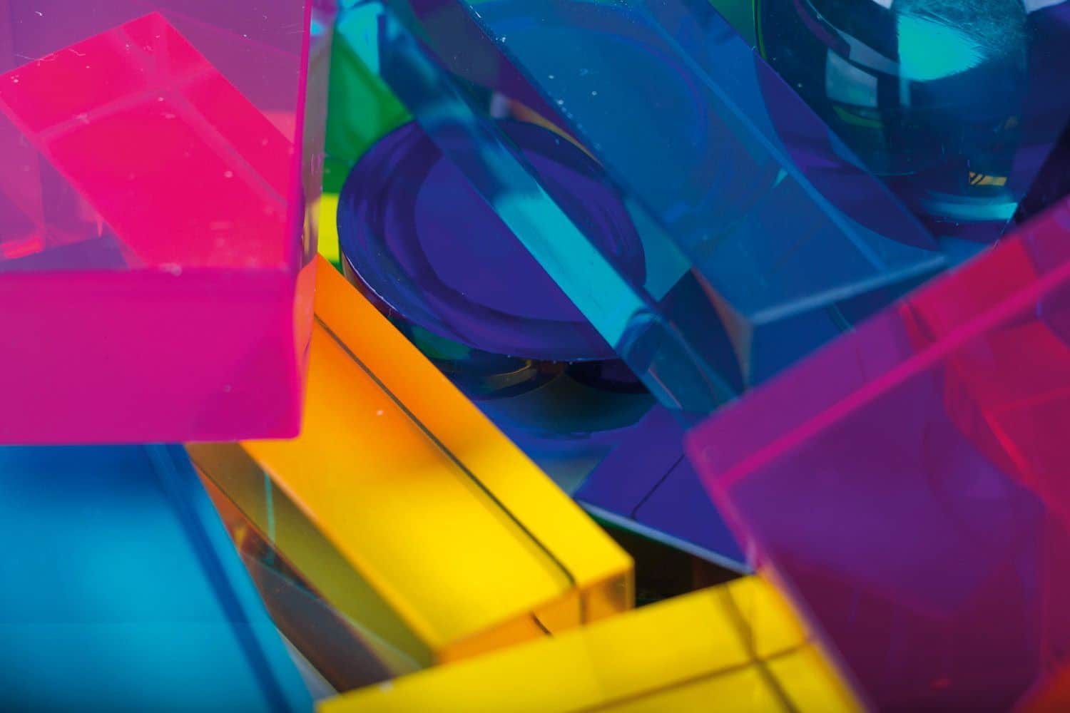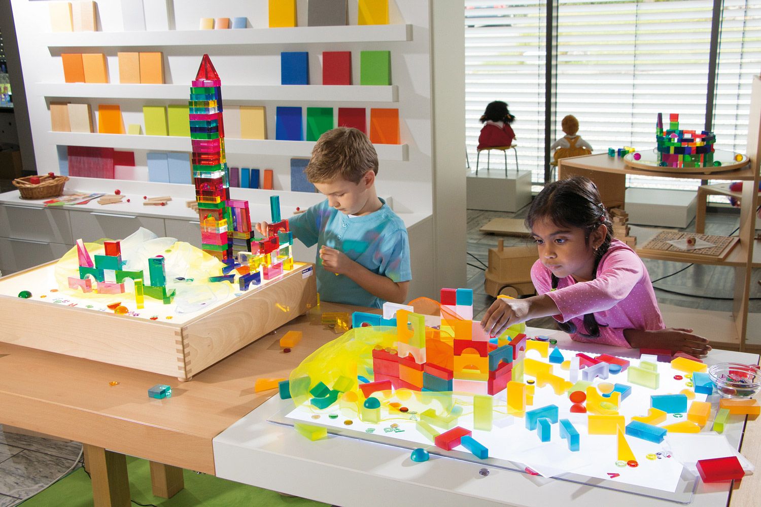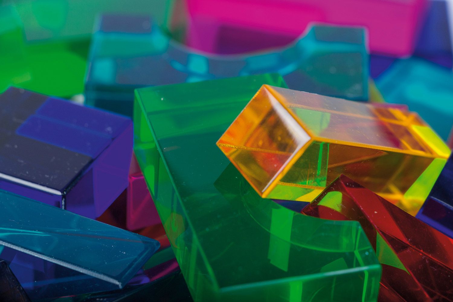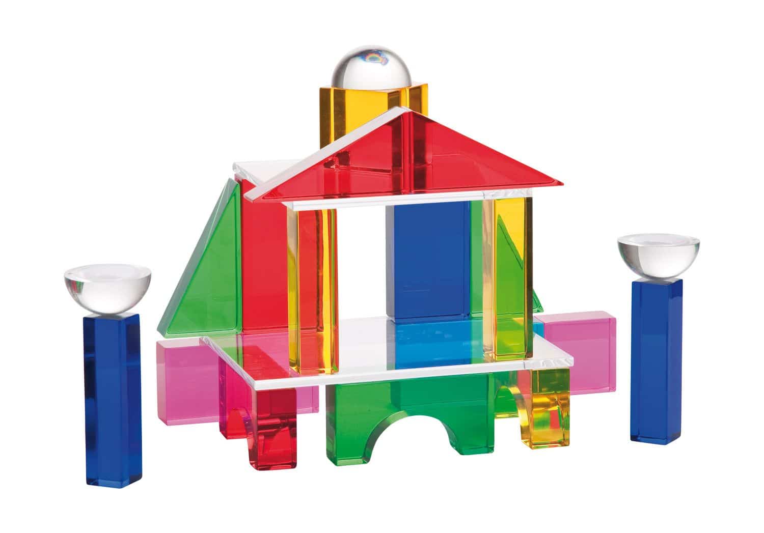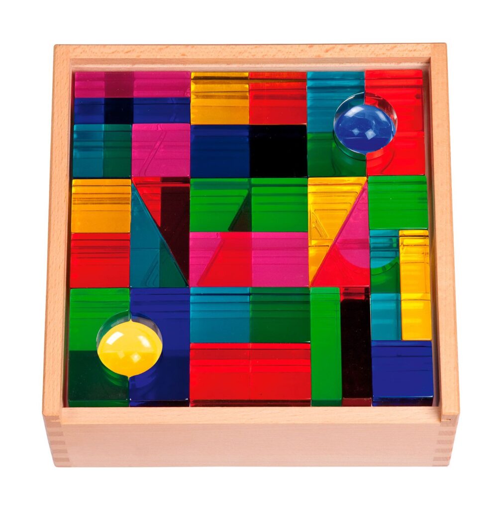 - Luxy Leuchtbausteine im Holzkasten bunt: 80 Steine (Säulensteine, Brückenbogen, Halbkugeln, diagonale geteilte Quader, halbe Quader, Quader), 14 glasklare Platten