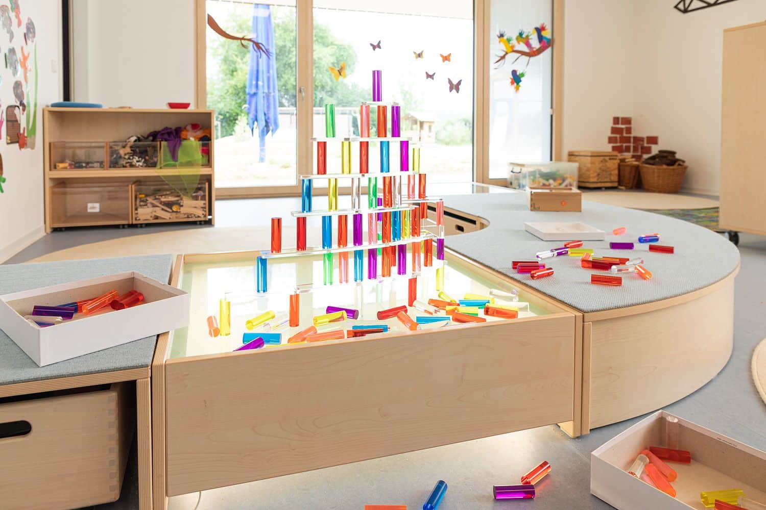 - Lernspiel mit Licht: Die transparenten Säulen schaffen zusammen mit Tageslicht oder einer Lichtplatte interessante Effekte. Das Spiel mit Licht und Farbe macht nicht nur Spaß, sondern fördert auch das Verständnis für visuelle Phänomene.