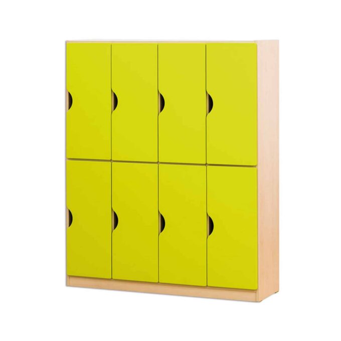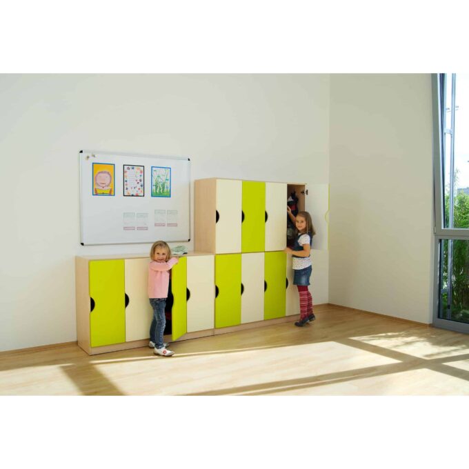 Die Betzold Maddox Kleiderschrank-Kombi KSK4 ist die perfekte Lösung, um Ordnung und Übersichtlichkeit in Kindergärten, Schulen oder sogar zu Hause zu schaffen. Mit acht geräumigen Fächern und individuell wählbaren Schranktürenfarben bietet dieser Schrank nicht nur viel Stauraum, sondern auch ein modernes, ansprechendes Design. Ob Wechselkleidung, Sportsachen oder Jacken und Schuhe – alles findet einen Platz hinter den leicht zu öffnenden Türen mit kindersicherer Halbkreisaussparung.