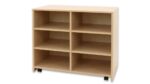 Der Regalschrank kann sowohl an der Wand als auch freistehend im Raum platziert werden, was ihn besonders anpassungsfähig macht. Die Rückwand aus robuster Spanplatte sorgt für die nötige Stabilität. Mit den 4 Rollen, von denen 2 feststellbar sind, lässt sich das Regal bequem verschieben, sodass es jederzeit leicht umgestellt werden kann – ideal für wechselnde Anforderungen im Klassenzimmer oder Kindergarten.