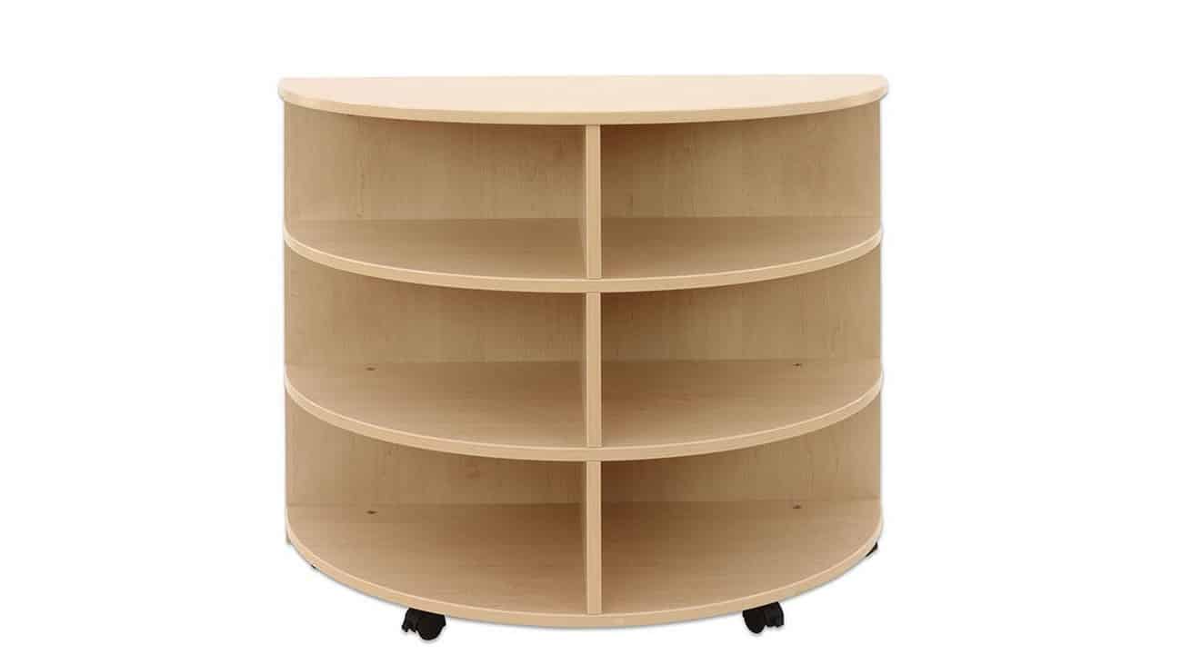 Das halbrunde Design des Regals ermöglicht eine freie Platzierung sowohl an der Wand als auch im Raum. Mit seinen 6 Fächern bietet es ausreichend Platz, um Bücher, Spielmaterial oder andere wichtige Utensilien ordentlich aufzubewahren. Die 4 integrierten Rollen, von denen 2 feststellbar sind, erlauben ein einfaches Verschieben des Regals, damit es je nach Bedarf flexibel umgestellt werden kann.
