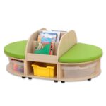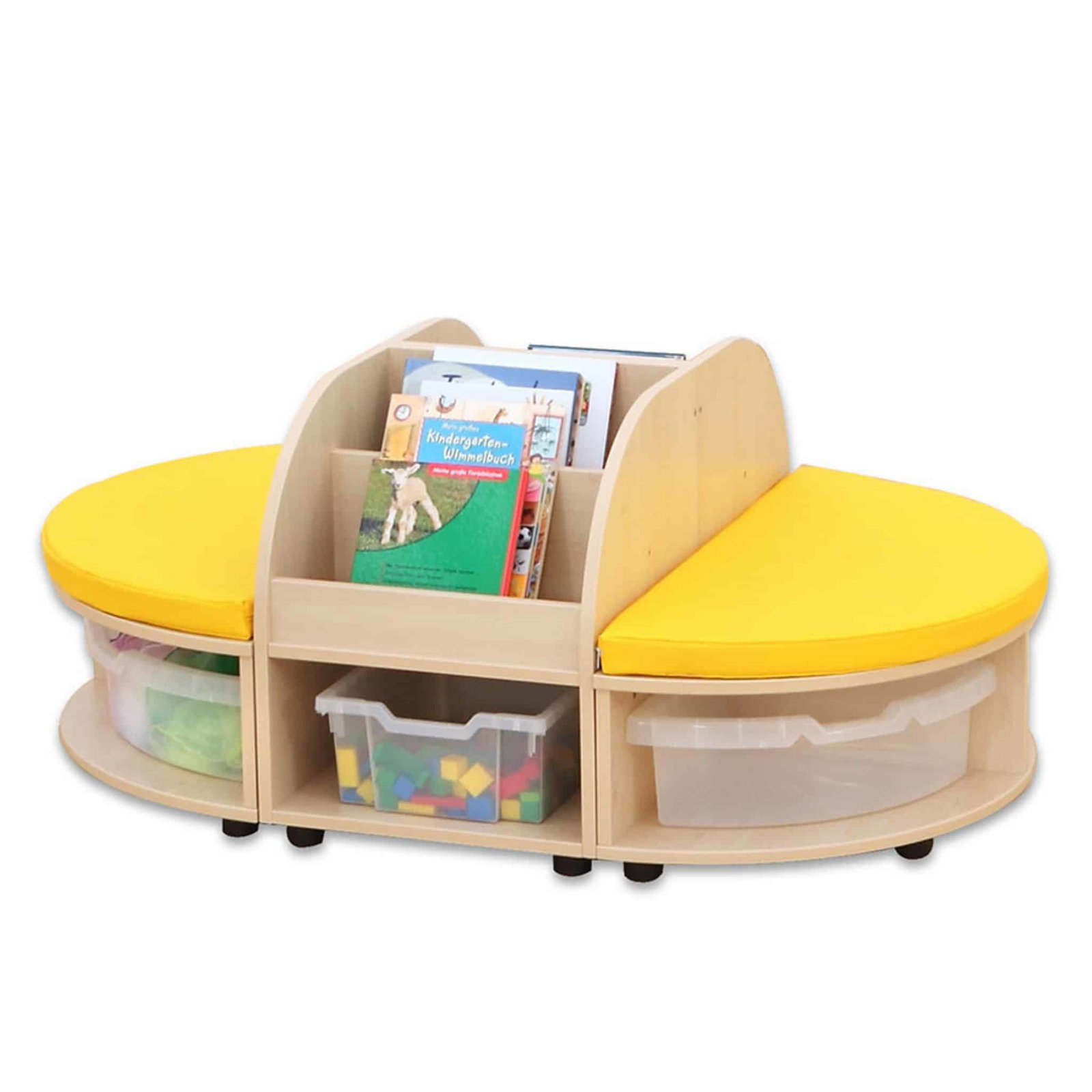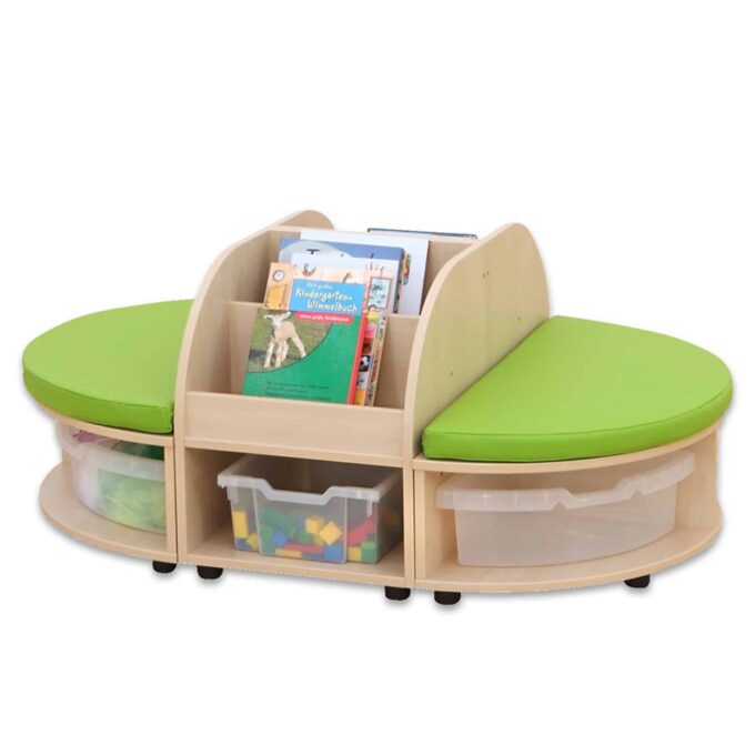 Die Betzold Maddox Sitzkombination 2 verbindet cleveres Design mit funktionalem Nutzen, um Kindergärten, Gruppenräume oder Spielbereiche optimal zu bereichern. Diese ovale Sitzkombination, bestehend aus zwei halbrunden Sitzbänken, zwei Bücherboxen und komfortablen Sitzmatten, sorgt für einen bequemen und organisierten Raum, in dem Kinder lesen, spielen und entspannen können. Der großzügige Stauraum bietet Platz für sechs Aufbewahrungsboxen und hilft dabei, Ordnung zu halten – ein Muss für jeden gut organisierten Raum.