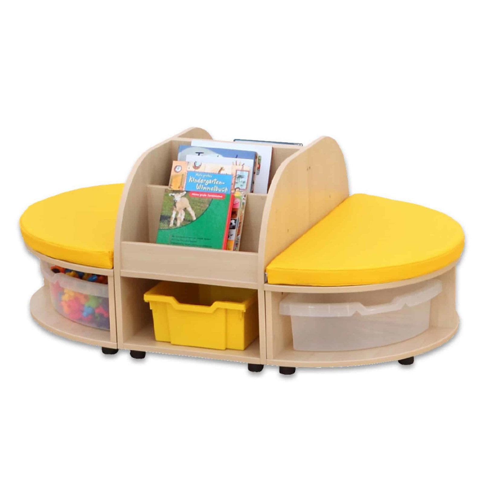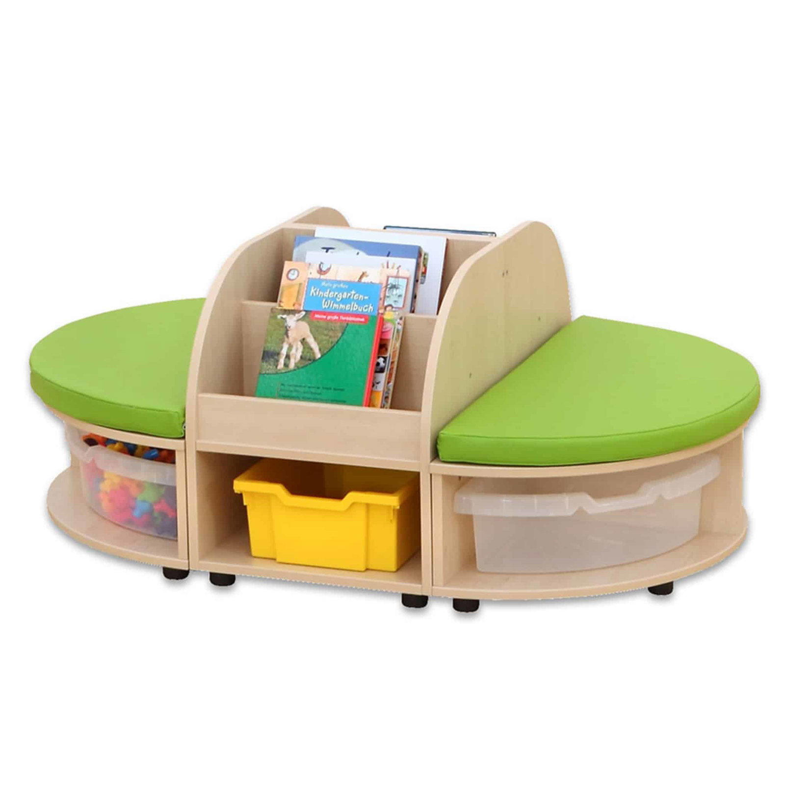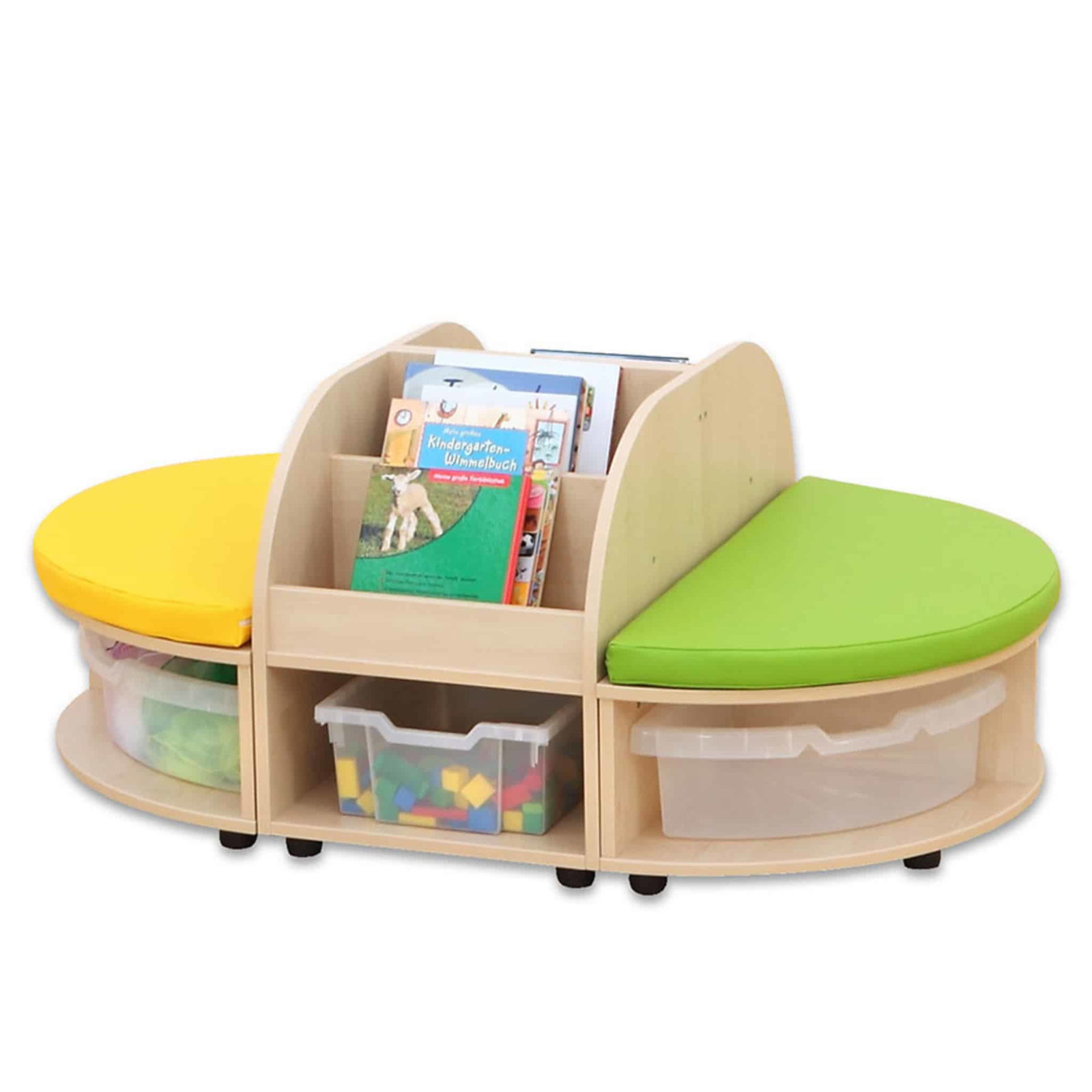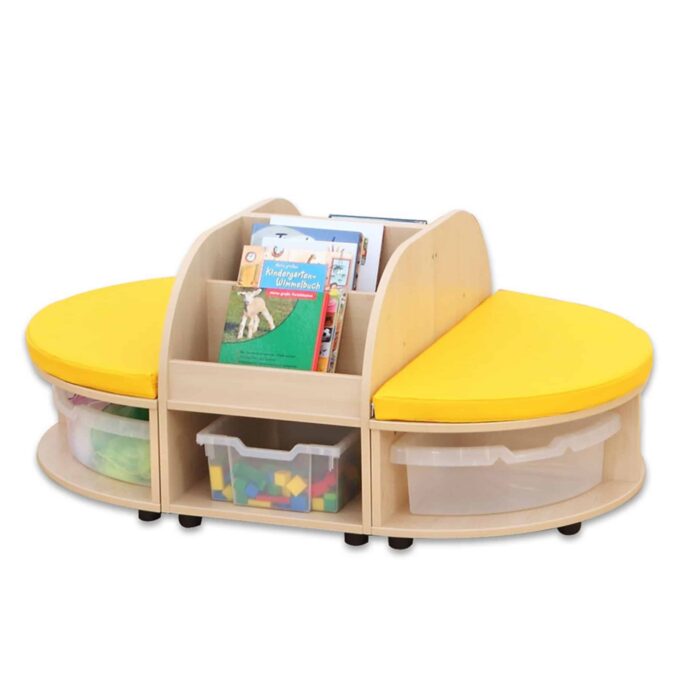 Dank ihrer robusten MDF-Bauweise mit hochwertiger Ahorn-Folie ist die Sitzkombination strapazierfähig und leicht zu reinigen, während die farbenfrohen Details in Gelb, Grün oder Transparent Lebendigkeit in jeden Raum bringen. Ob an der Wand oder freistehend platziert, die Kombination fügt sich harmonisch in jede Raumgestaltung ein. Egal ob Bücher, Spielmaterialien oder andere Utensilien – alles hat seinen festen Platz.