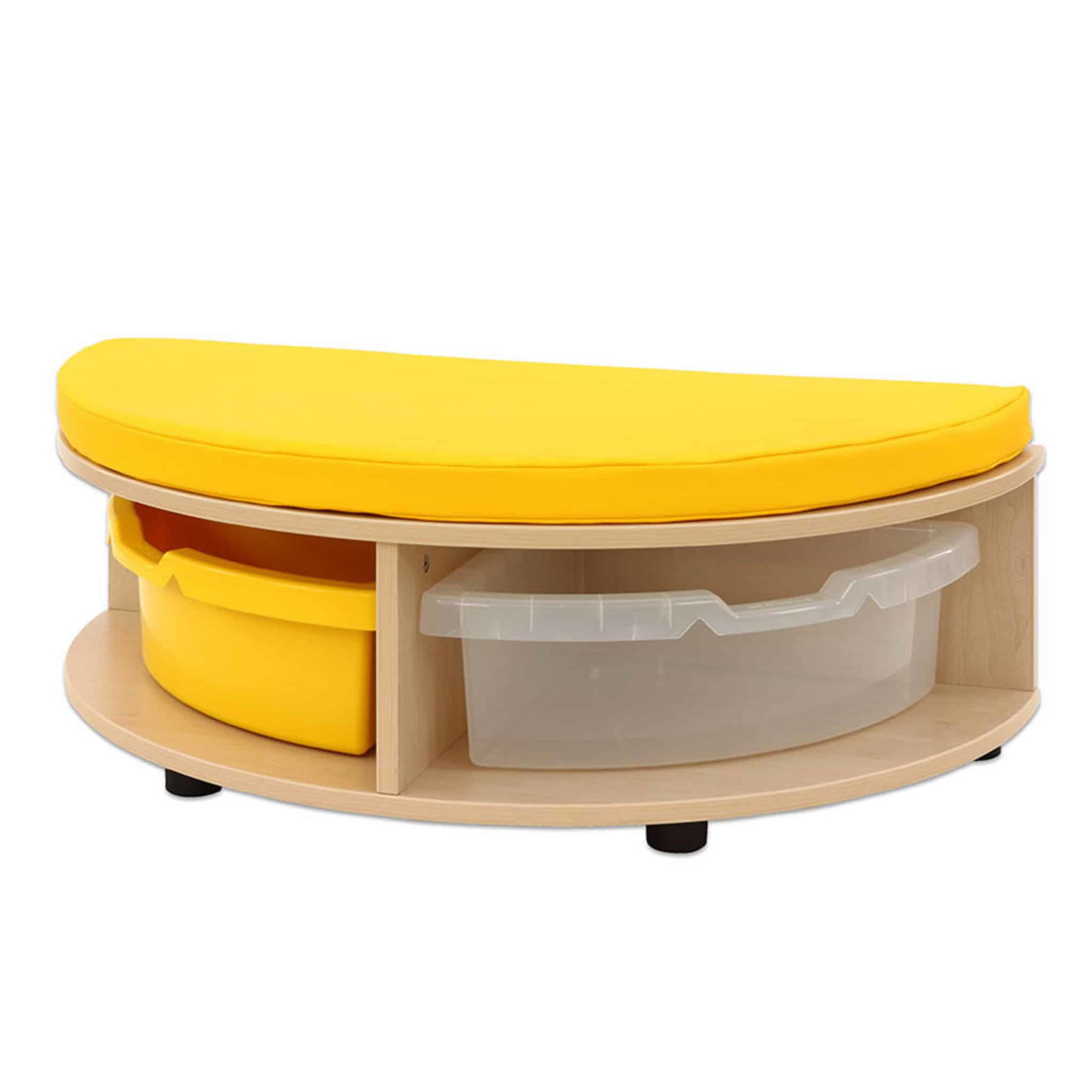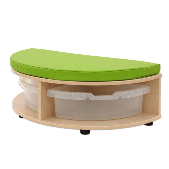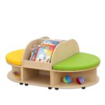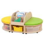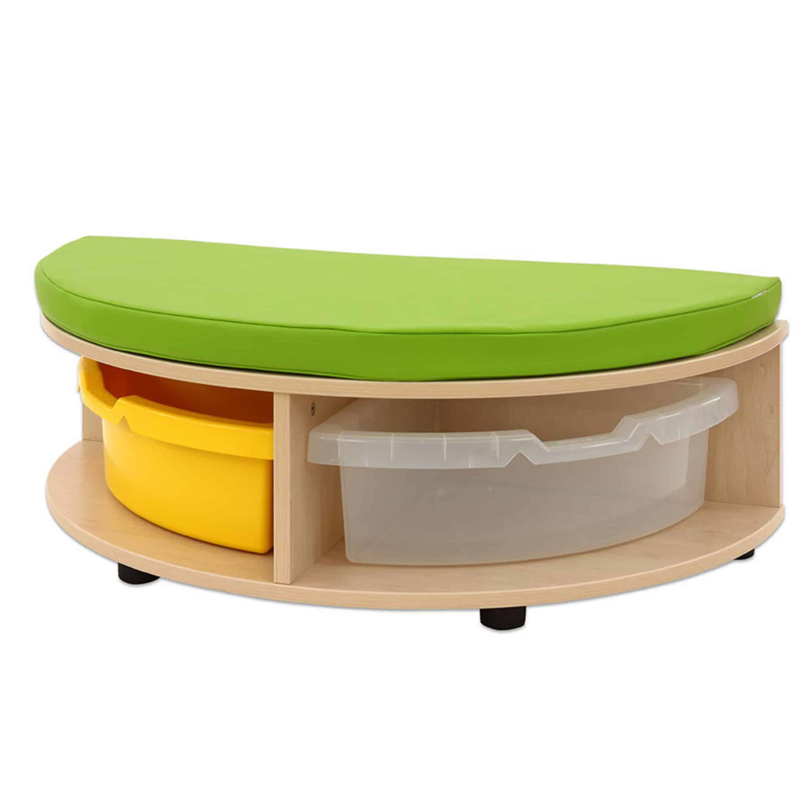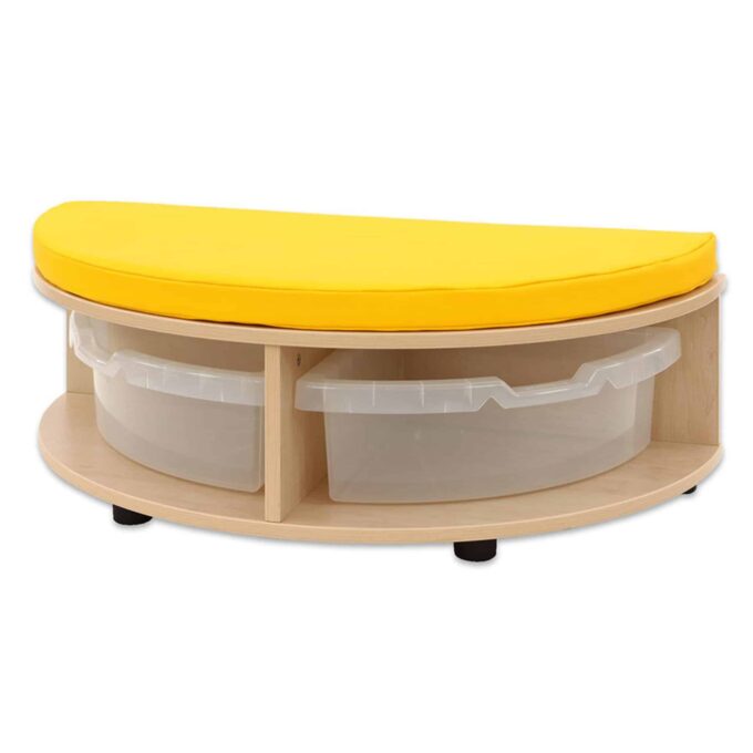 Dank ihrer robusten MDF-Bauweise mit hochwertiger Ahorn-Folie ist die Sitzkombination strapazierfähig und leicht zu reinigen, während die farbenfrohen Details in Gelb, Grün oder Transparent Lebendigkeit in jeden Raum bringen. Ob an der Wand oder freistehend platziert, die Kombination fügt sich harmonisch in jede Raumgestaltung ein. Egal ob Bücher, Spielmaterialien oder andere Utensilien – alles hat seinen festen Platz.