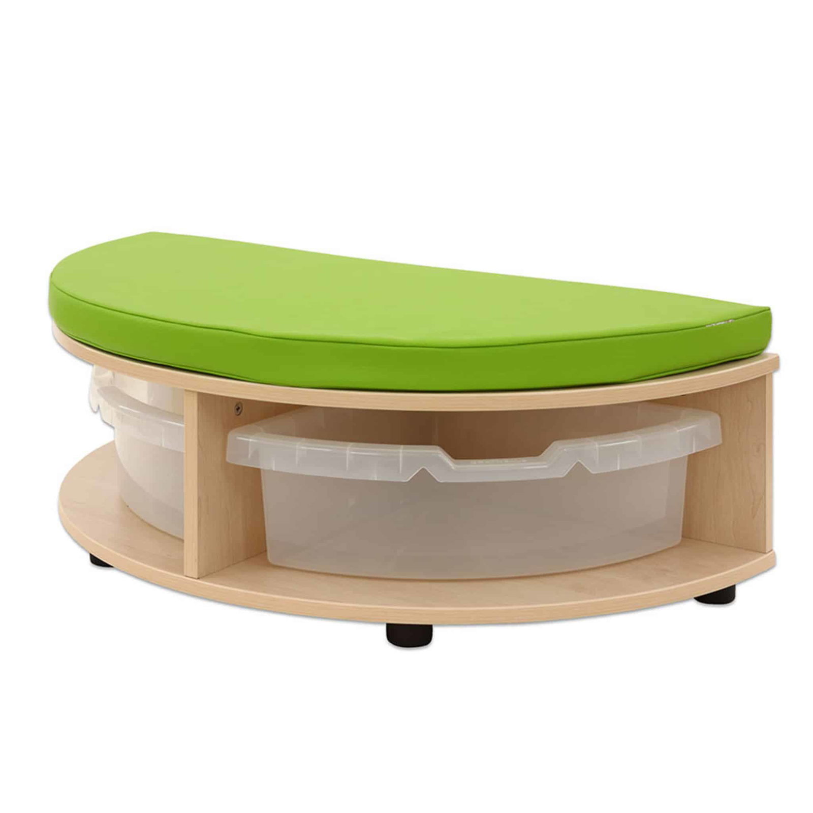 - Praktische Aufbewahrungsboxen: Unter den Sitzbänken finden sechs stabile Kunststoffboxen Platz – ideal für Spielsachen, Bausteine oder kreative Materialien.