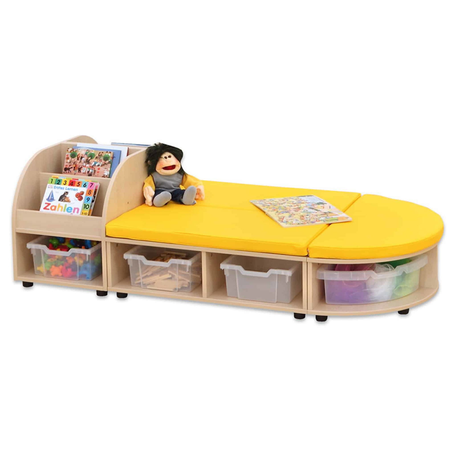 Unter den Bänken und in den Bücherboxen versteckt sich reichlich Stauraum, der mit bis zu acht Aufbewahrungsboxen (optional) genutzt werden kann. Ob Bücher, Spielzeug oder andere Utensilien – alles findet einen festen Platz. Die hochwertigen Materialien wie robustes MDF mit einer abriebbeständigen Ahorn-Beschichtung machen die Sitzkombination besonders langlebig und pflegeleicht. Dank der flexiblen Gestaltung kann die Sitzbank freistehend im Raum platziert werden und passt sich so optimal Ihren Bedürfnissen an.