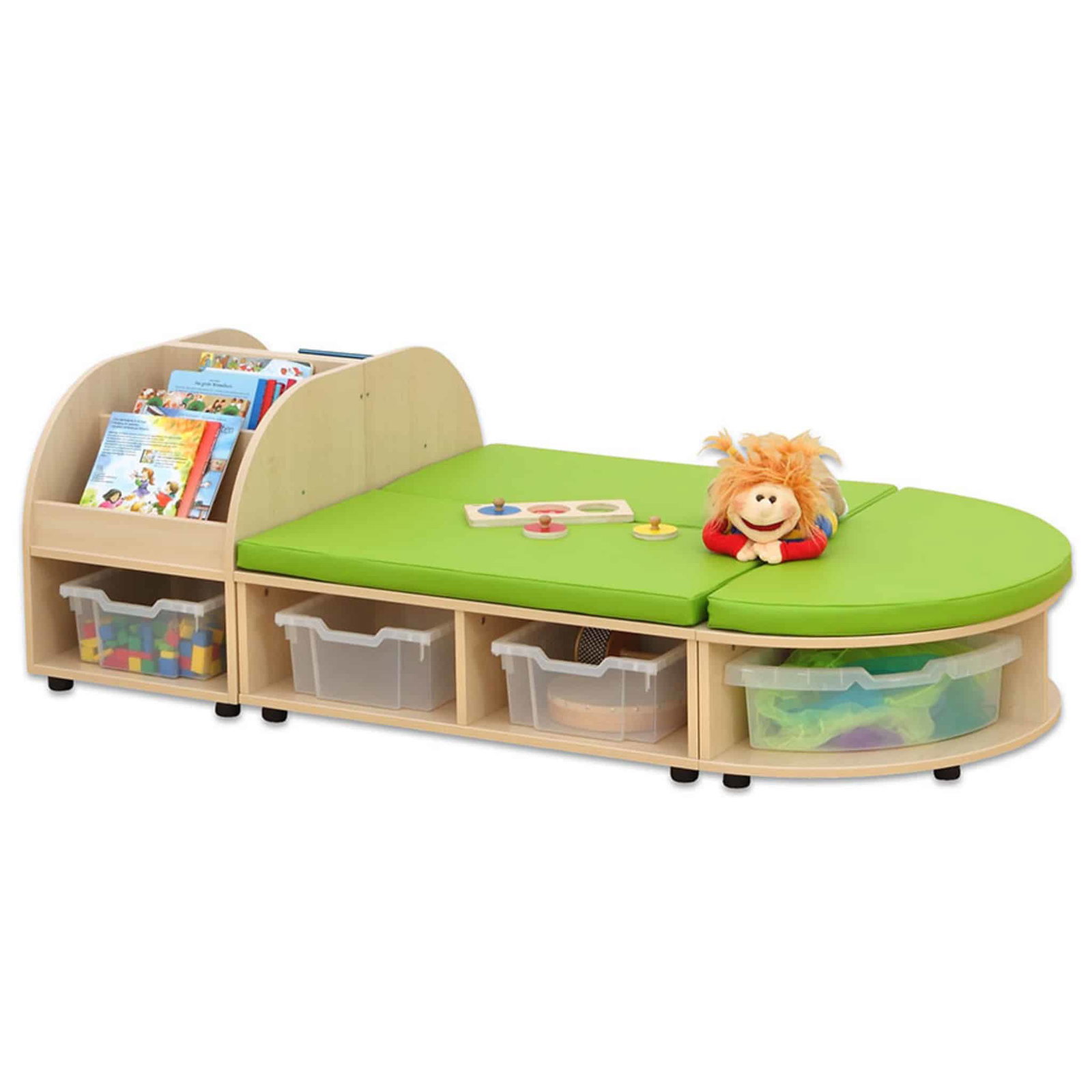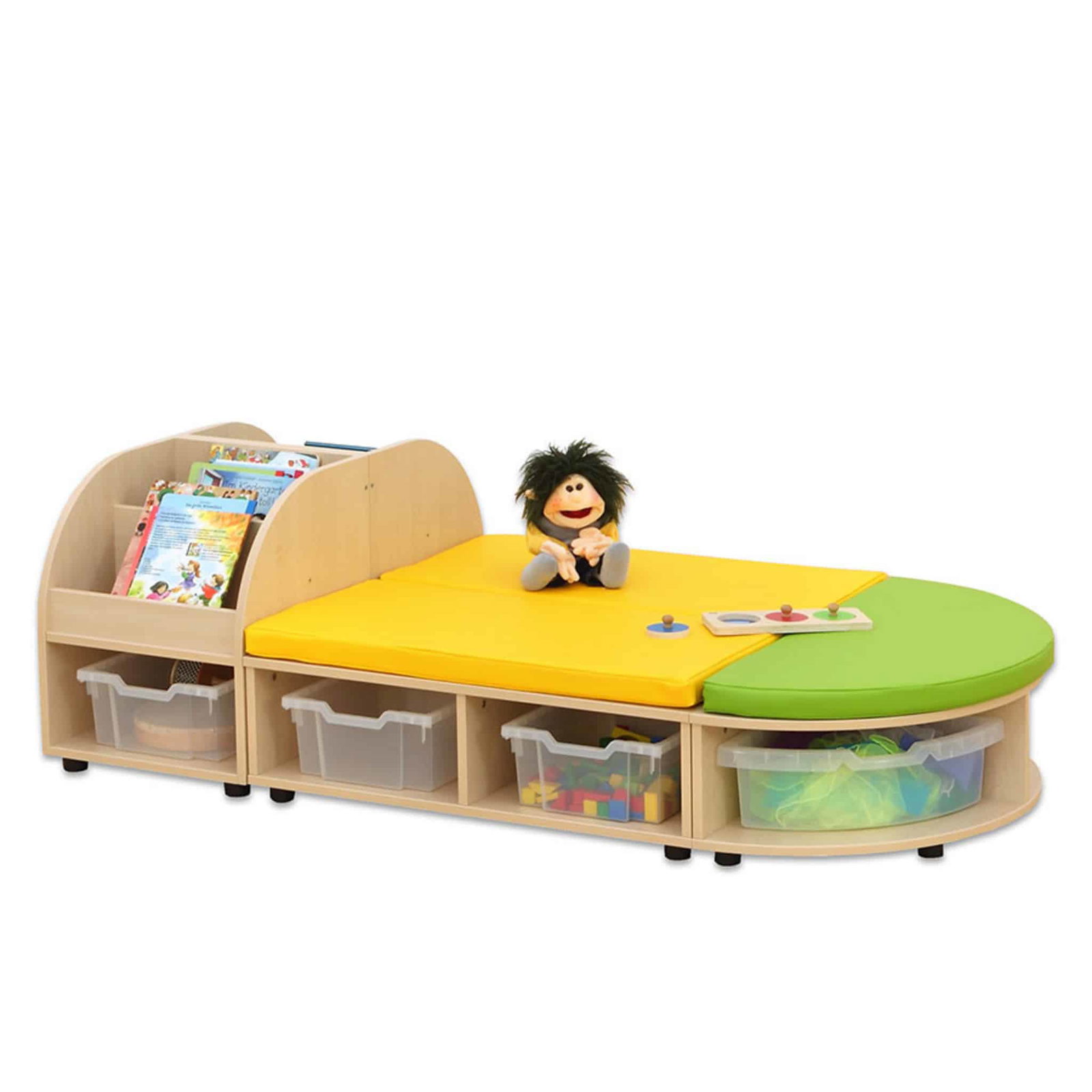 Die Betzold Maddox Sitzkombination 6 ist die ideale Lösung für Kindergärten, Gruppenräume oder Spielbereiche, in denen Funktionalität und Ästhetik gefragt sind. Diese clevere Kombination aus Sitzmöglichkeiten und Stauraum schafft eine einladende Atmosphäre, in der Kinder lesen, spielen oder gemeinsam entspannen können. Mit drei Sitzbänken, darunter eine halbrunde Bank, und zwei praktischen Bücherboxen bietet die Sitzkombination vielseitige Einsatzmöglichkeiten. Die mitgelieferten Sitzmatten sorgen für noch mehr Komfort und laden zum Verweilen ein.