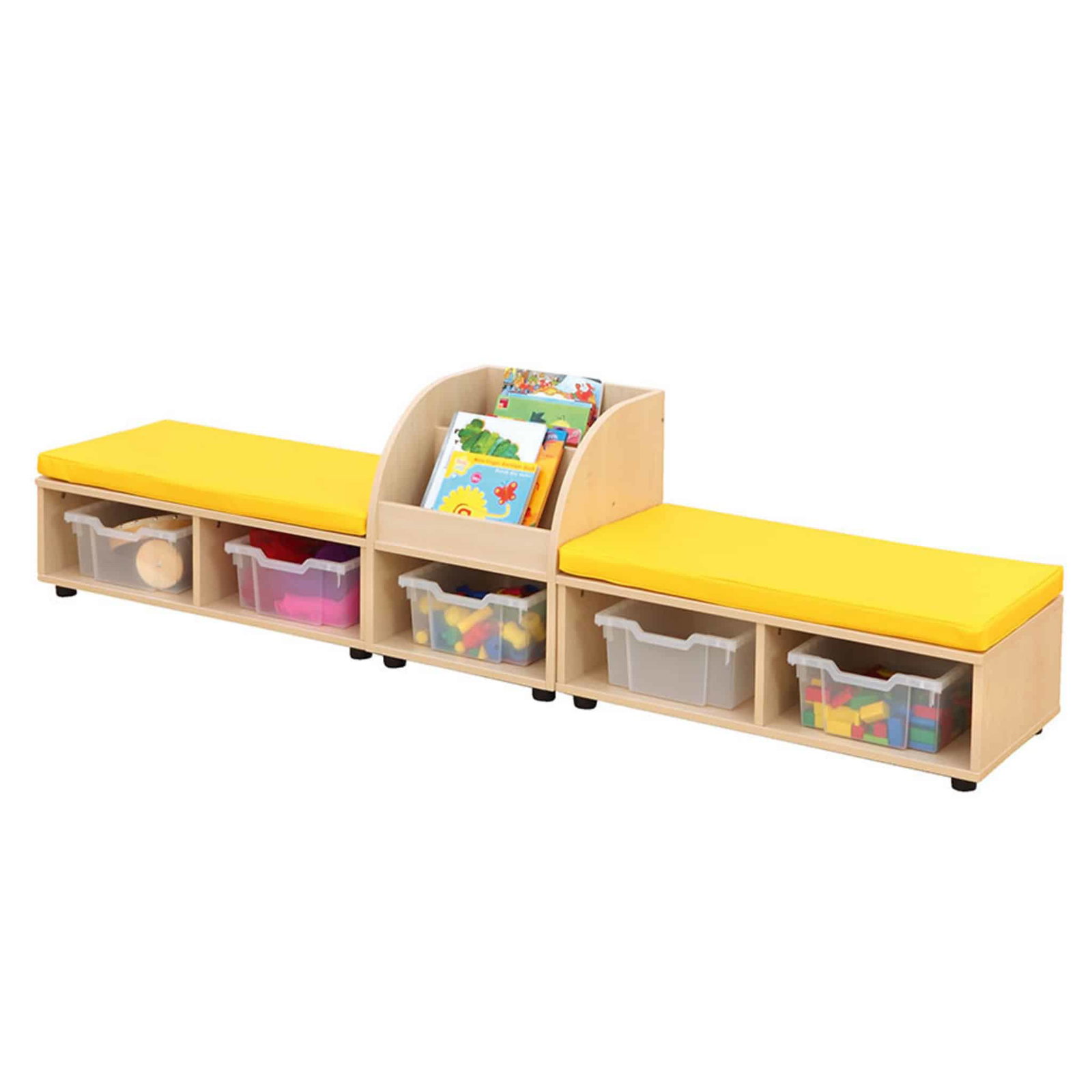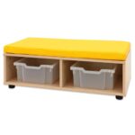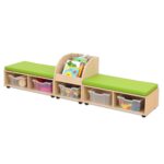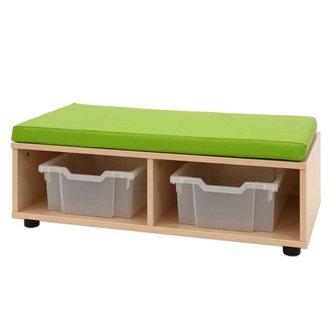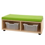 - Fächer mit Boxen: Die Sitzkombination bietet Platz für bis zu fünf transparente Kunststoffboxen, um Spielzeug, Bausteine oder andere Utensilien ordentlich zu verstauen.