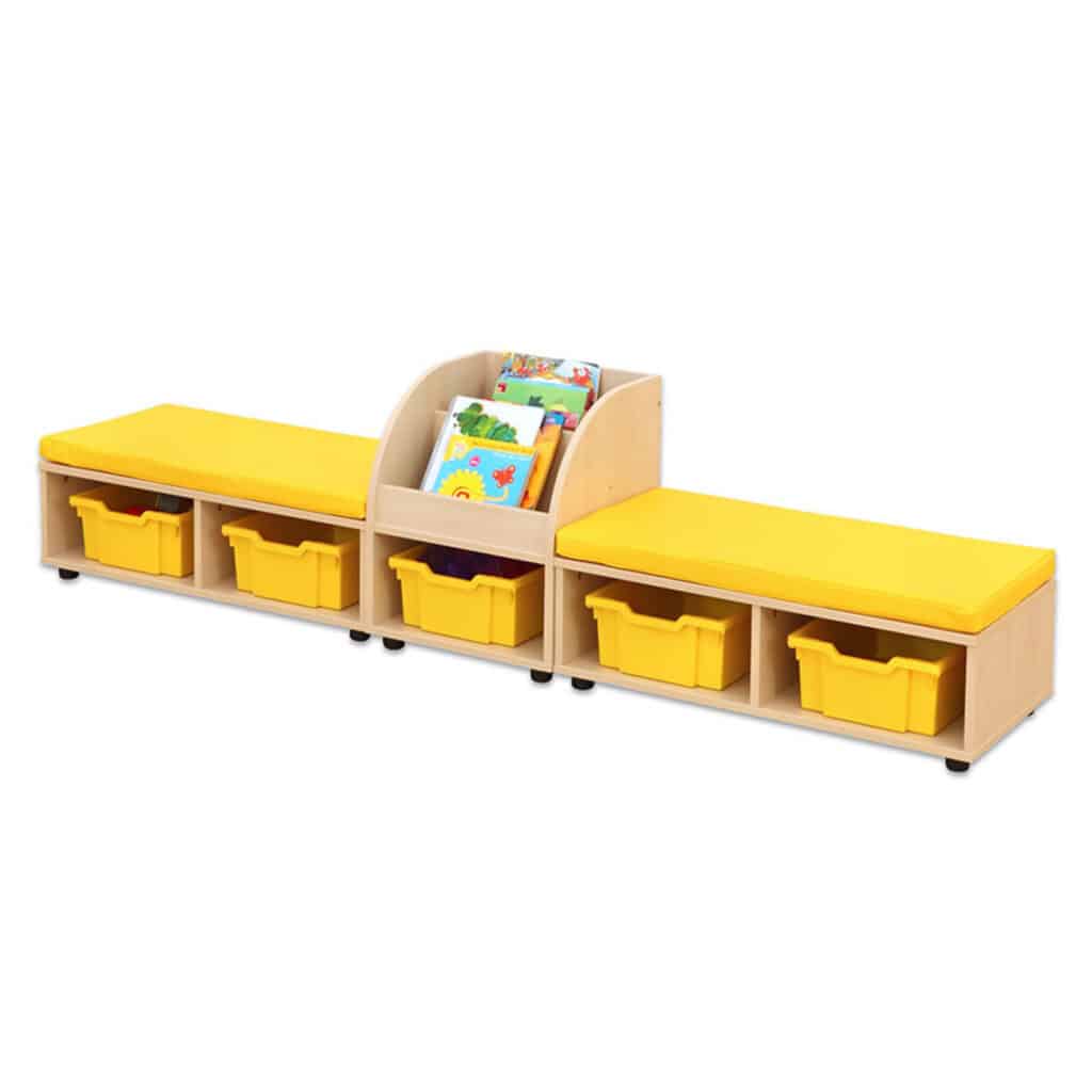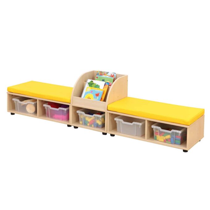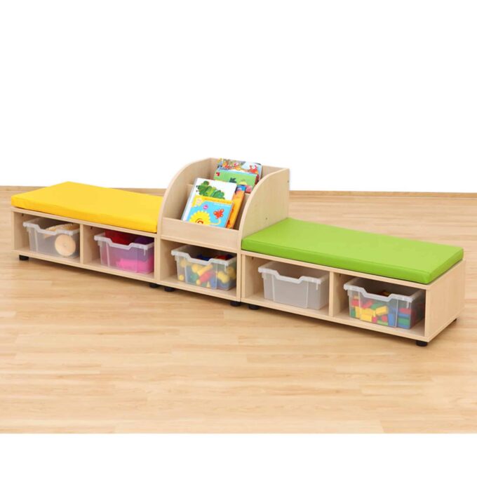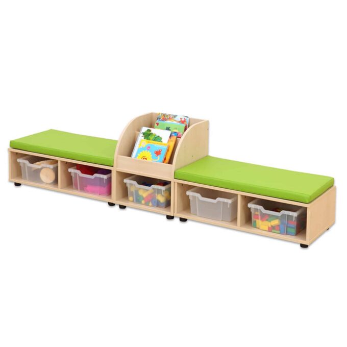 Die Betzold Maddox Sitzkombination 9 ist die ideale Lösung für Kindergärten oder Gemeinschaftsräume, in denen Funktionalität und Gemütlichkeit gleichermaßen gefragt sind. Mit zwei komfortablen Sitzbänken, einer praktischen Bücherbox und dazu passenden Sitzmatten schafft sie ein einladendes Umfeld zum Lesen, Entspannen und gemeinsamen Lernen. Gleichzeitig hält die Sitzkombination den Raum aufgeräumt, da sie durch integrierte Fächer und optionalen Boxen genügend Stauraum für Utensilien wie Spielzeug, Bausteine oder Bücher bietet.