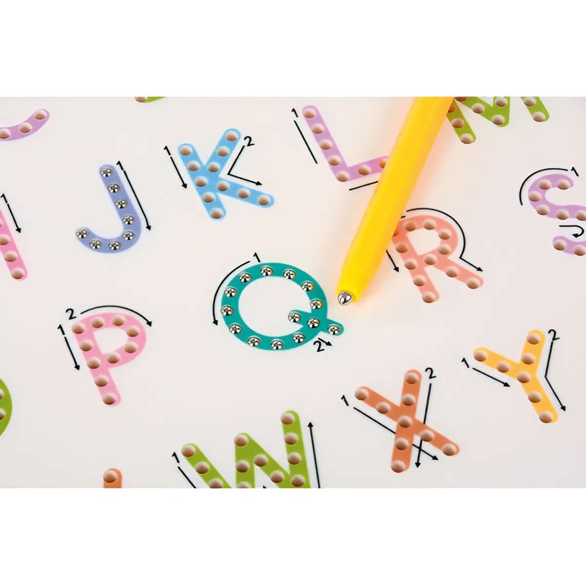 Das Herzstück dieses Lernspielzeugs ist das clevere, zweiseitige Design. Eine Seite widmet sich den Großbuchstaben, die andere den Kleinbuchstaben sowie den Zahlen von 0 bis 9 und wichtigen Rechenzeichen. Aufgedruckte Pfeile und Nummerierungen zeigen dabei präzise die korrekte Reihenfolge und Richtung der Strichführung an. So prägt sich der richtige Bewegungsablauf von Anfang an ein. Das befriedigende Klicken der Kugeln und die sofortige visuelle Kontrolle machen das Schreibenlernen zu einem motivierenden Spiel, das ohne Papier, Schmutz und Radiergummi auskommt.