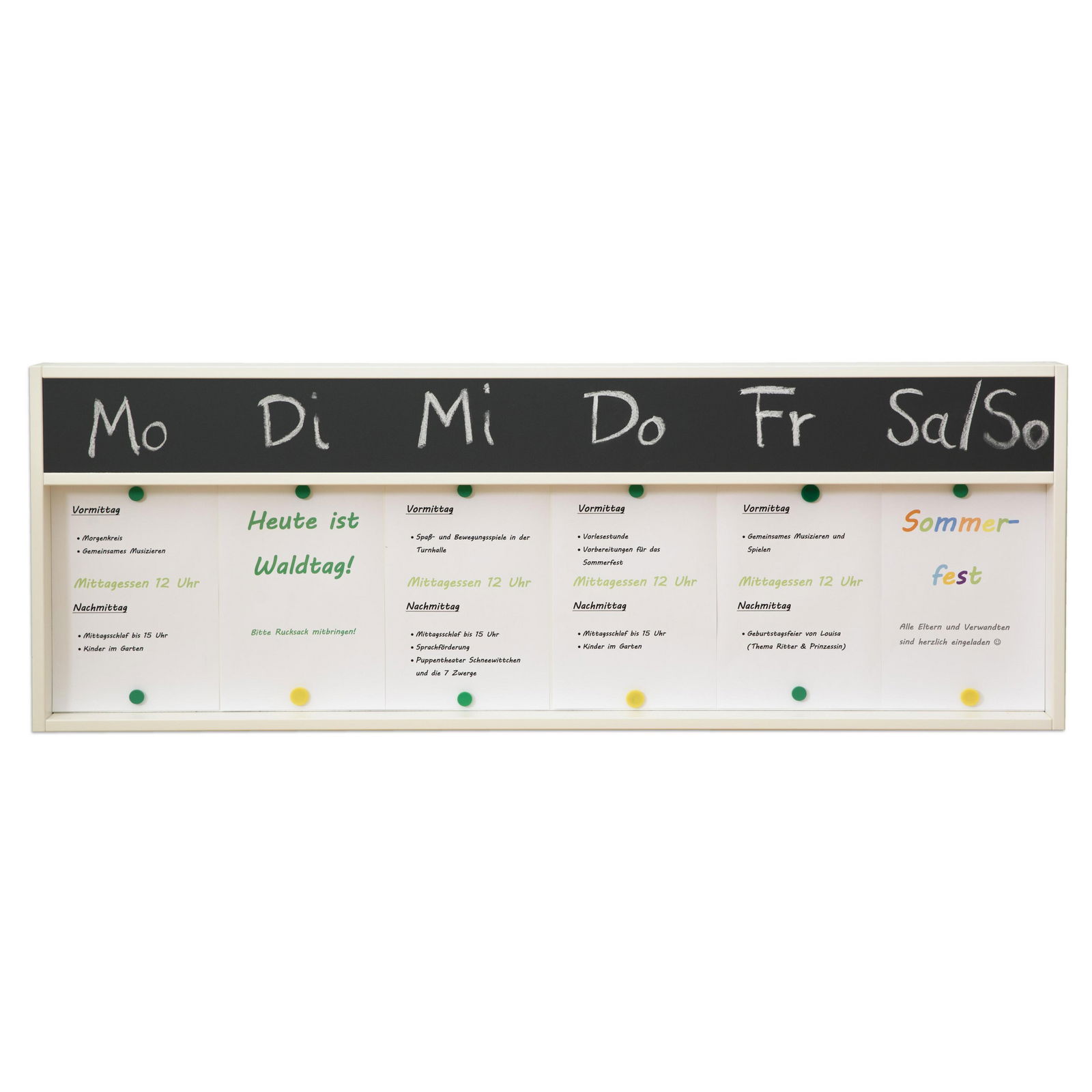 - Individuelle Beschriftung: Die obere Leiste ist mit klassischer Tafelkreide oder Kreidemarkern beschreibbar. Nutzen Sie diesen Bereich für Überschriften, Wochentage, Namen oder wichtige Hinweise, die den darunter hängenden Dokumenten Kontext geben.