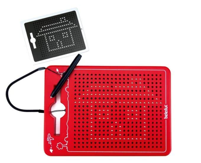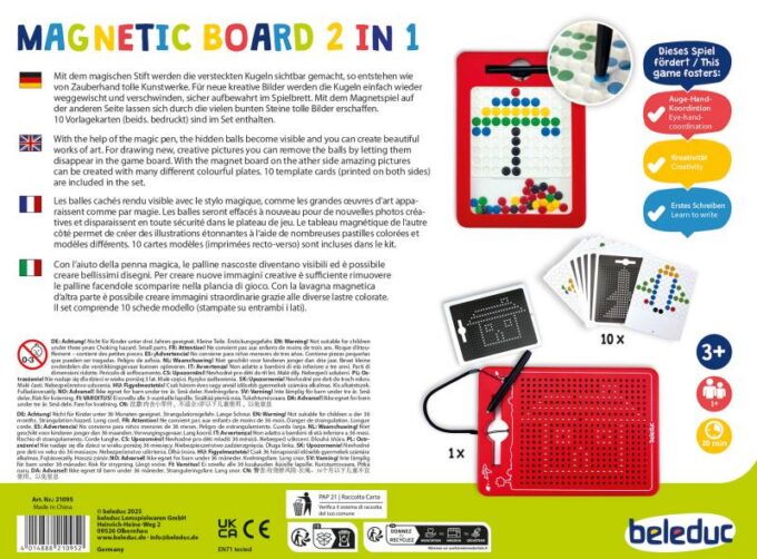 Auf der einen Seite erleben kleine Künstler echte Magie: Mit einem speziellen Magnetstift werden versteckte Metallkugeln an die Oberfläche gezogen, wodurch wie von Zauberhand silberne Linien und Bilder entstehen. Dreht man das Board um, wartet eine bunte Mosaikwelt darauf, entdeckt zu werden. Hier können mit farbigen Steinen leuchtende Muster und Bilder gelegt werden. Ob freies Gestalten oder das Nachbilden der beiliegenden Vorlagen – dieses Board ist ein vielseitiges Werkzeug gegen Langeweile, das die Fantasie anregt und gleichzeitig wichtige motorische Fähigkeiten schult.