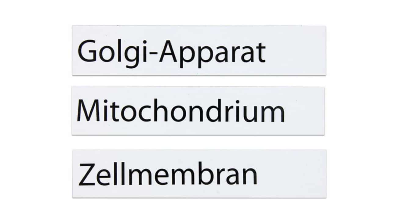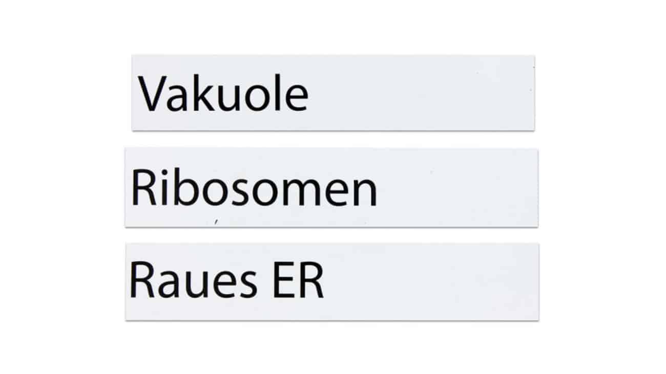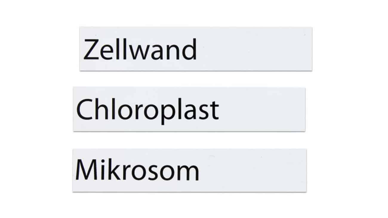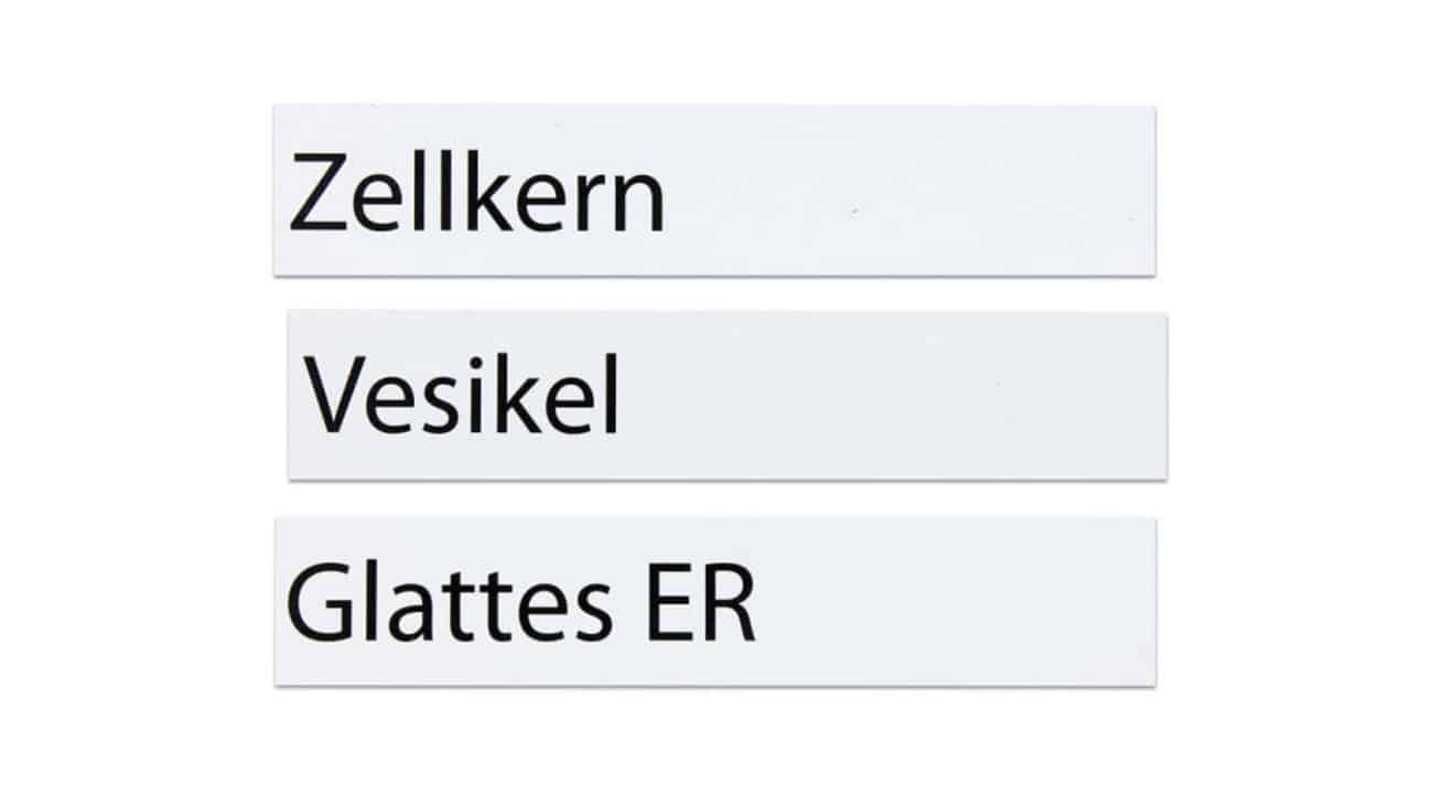 Für den bilingualen Unterricht (Deutsch/Englisch) stehen 13 doppelseitig bedruckte Namensschilder zur Verfügung, die auf der Rückseite die englischen Begriffe darstellen. Dies fördert nicht nur das Verständnis für biologisches Vokabular, sondern auch die Sprachkenntnisse der Schüler.