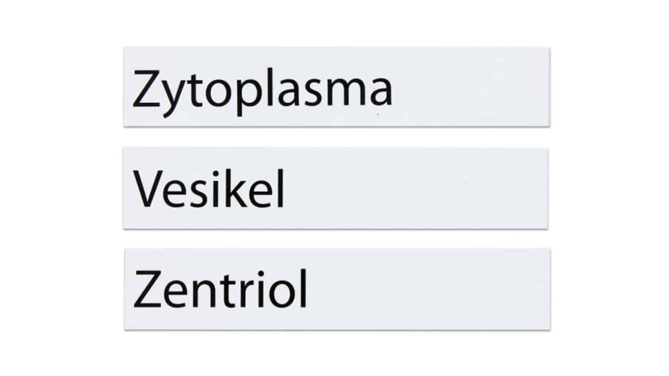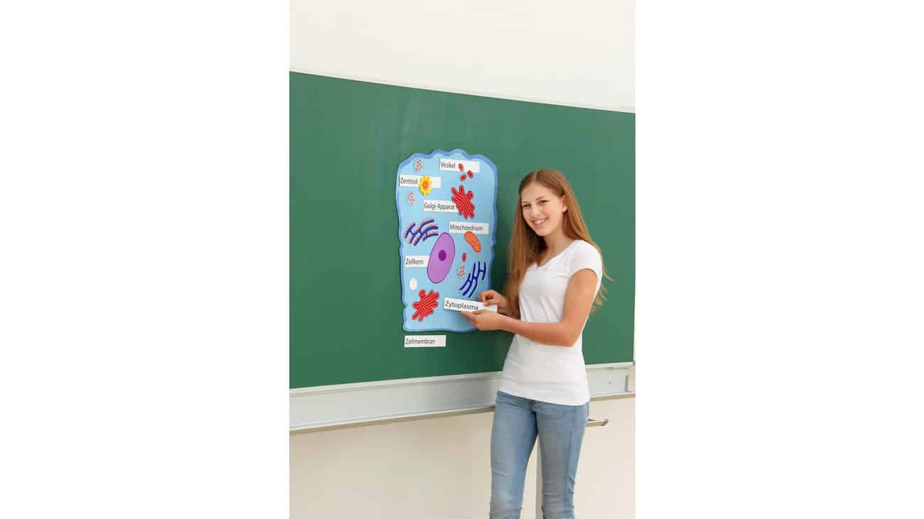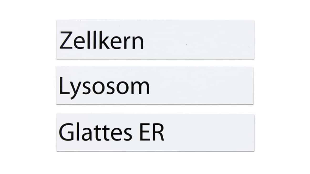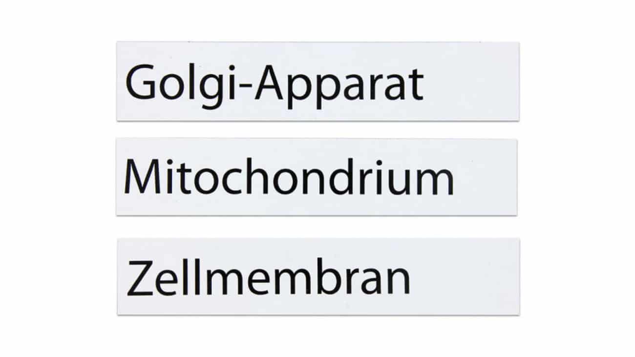 Die doppelseitig bedruckten Namensschilder (in Deutsch und Englisch) ermöglichen es, die Zellbestandteile unmittelbar zu benennen und sind besonders nützlich im bilingualen Unterricht. Der Einsatz von Magneten sorgt dafür, dass die Teile sicher an der Tafel haften und nicht verrutschen.