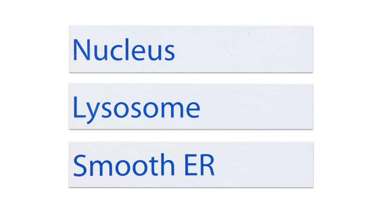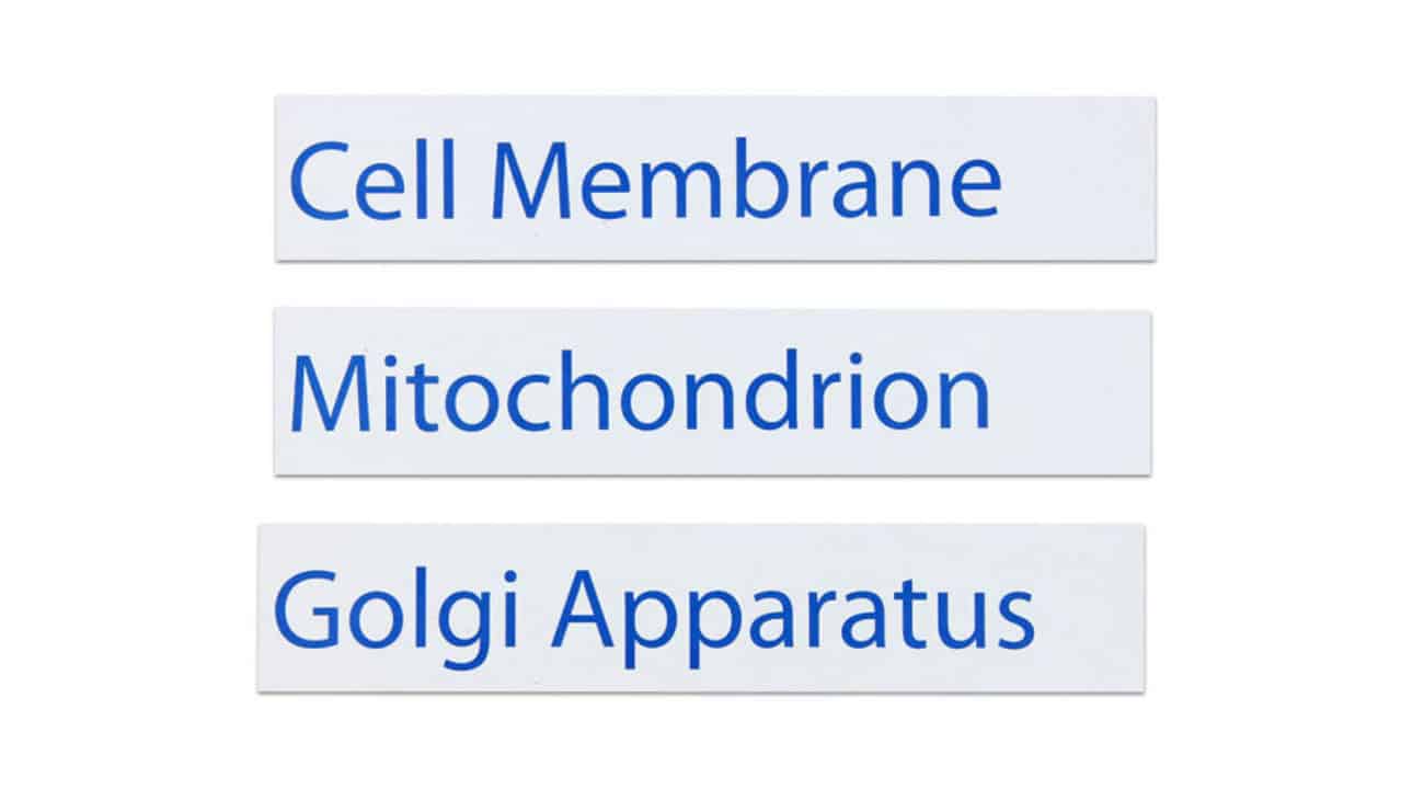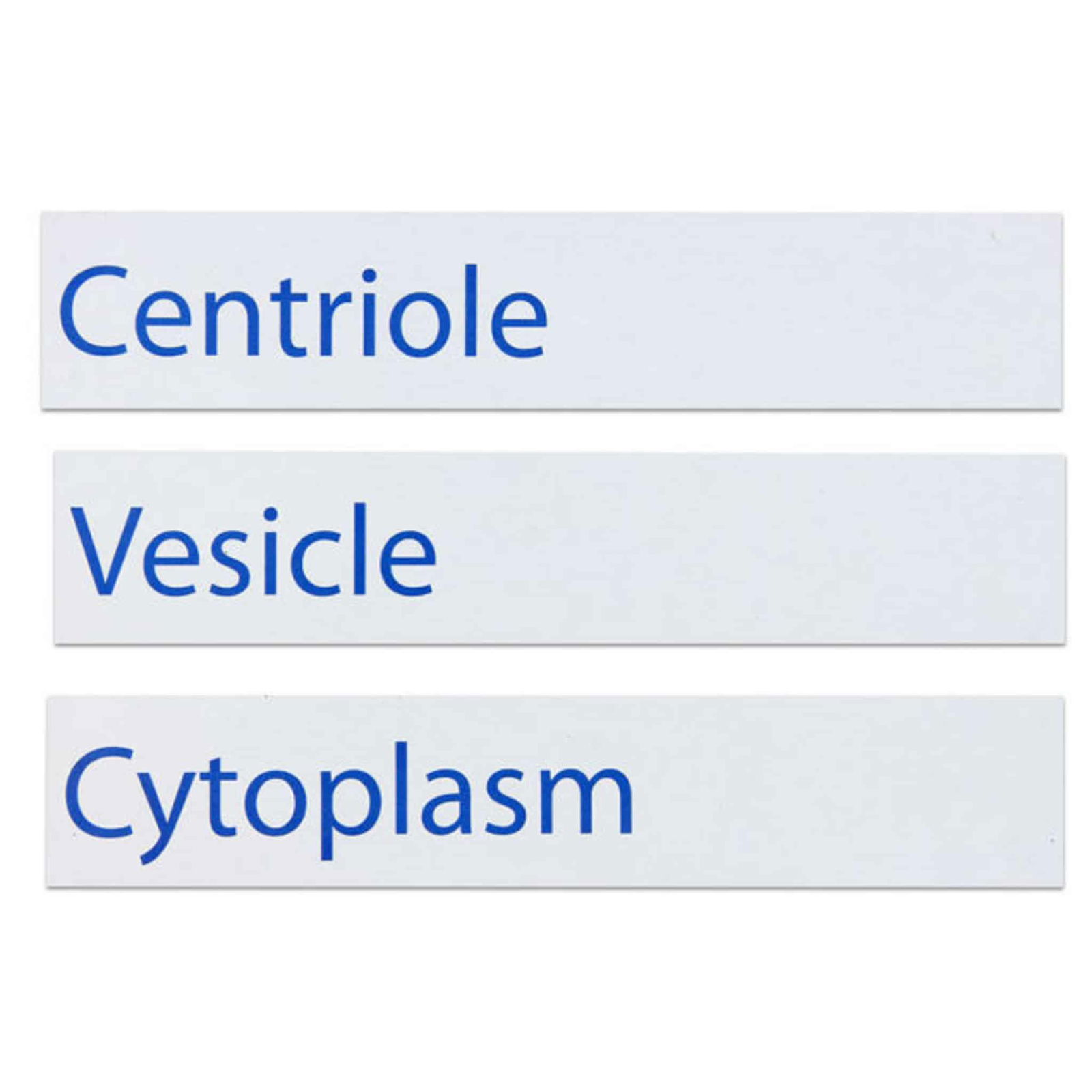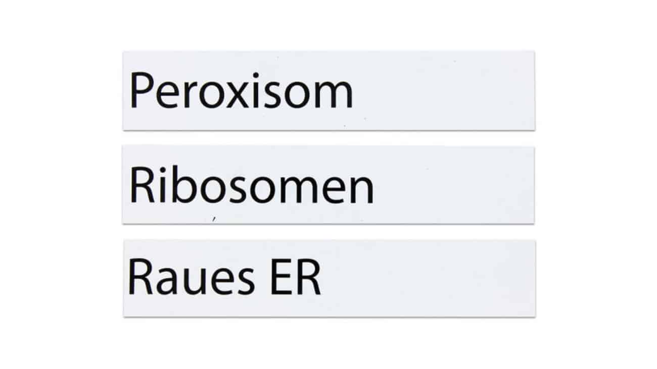 Die doppelseitig bedruckten Namensschilder (in Deutsch und Englisch) ermöglichen es, die Zellbestandteile unmittelbar zu benennen und sind besonders nützlich im bilingualen Unterricht. Der Einsatz von Magneten sorgt dafür, dass die Teile sicher an der Tafel haften und nicht verrutschen.