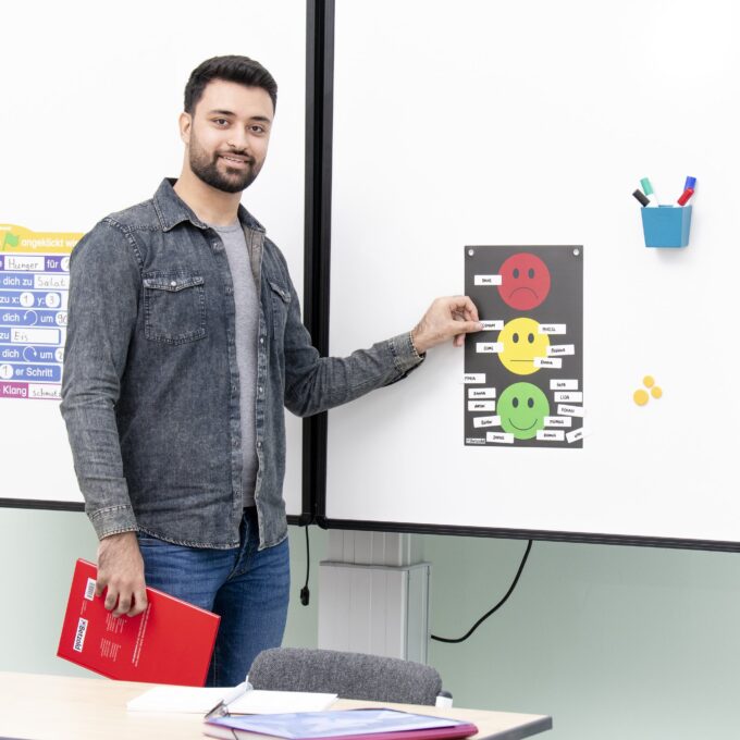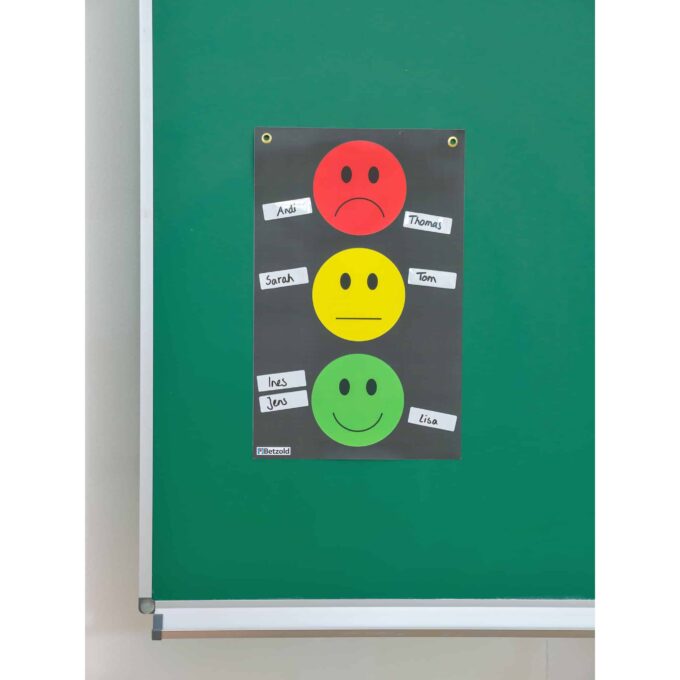 Die magnetische Verhaltensampel bietet die Möglichkeit, das Verhalten der Schüler transparent und nachvollziehbar zu visualisieren. Klare Bilder und die bekannten Ampelfarben (grün, gelb, rot) helfen den Kindern sofort zu verstehen, wofür sie jeweils stehen. Die Ampel kann leicht an jeder magnethaftenden Fläche befestigt werden, oder dank der zwei Aufhänger auch an Wänden verwendet werden, um Sichtbarkeit zu garantieren.