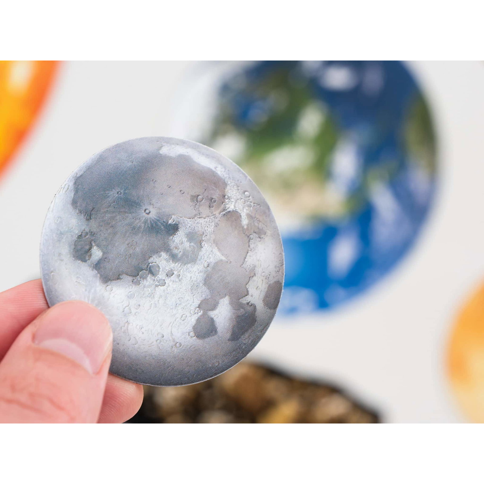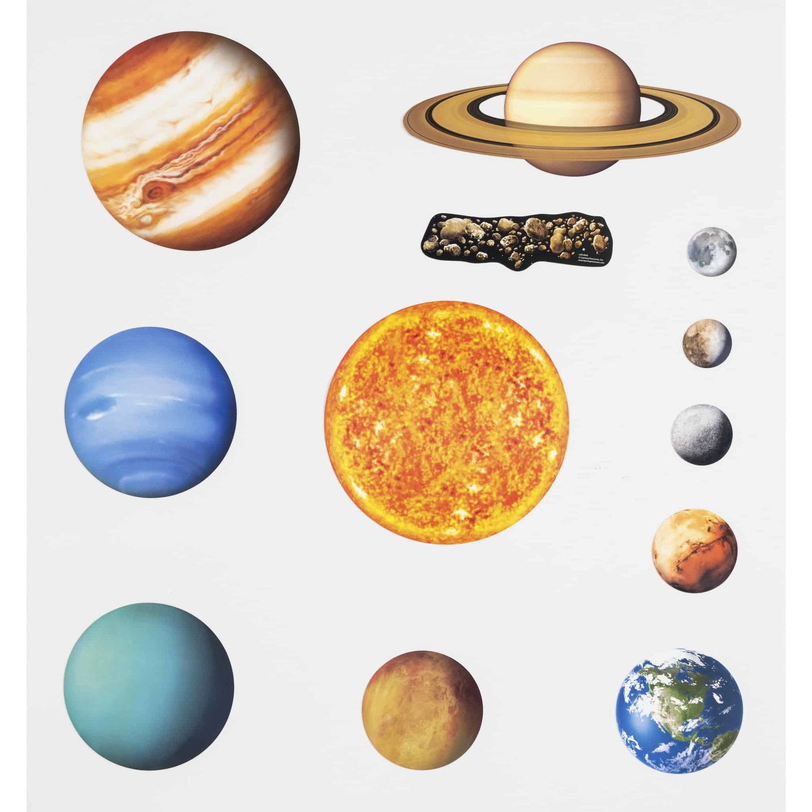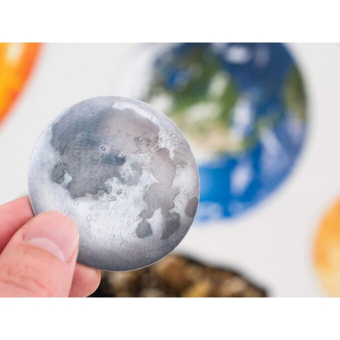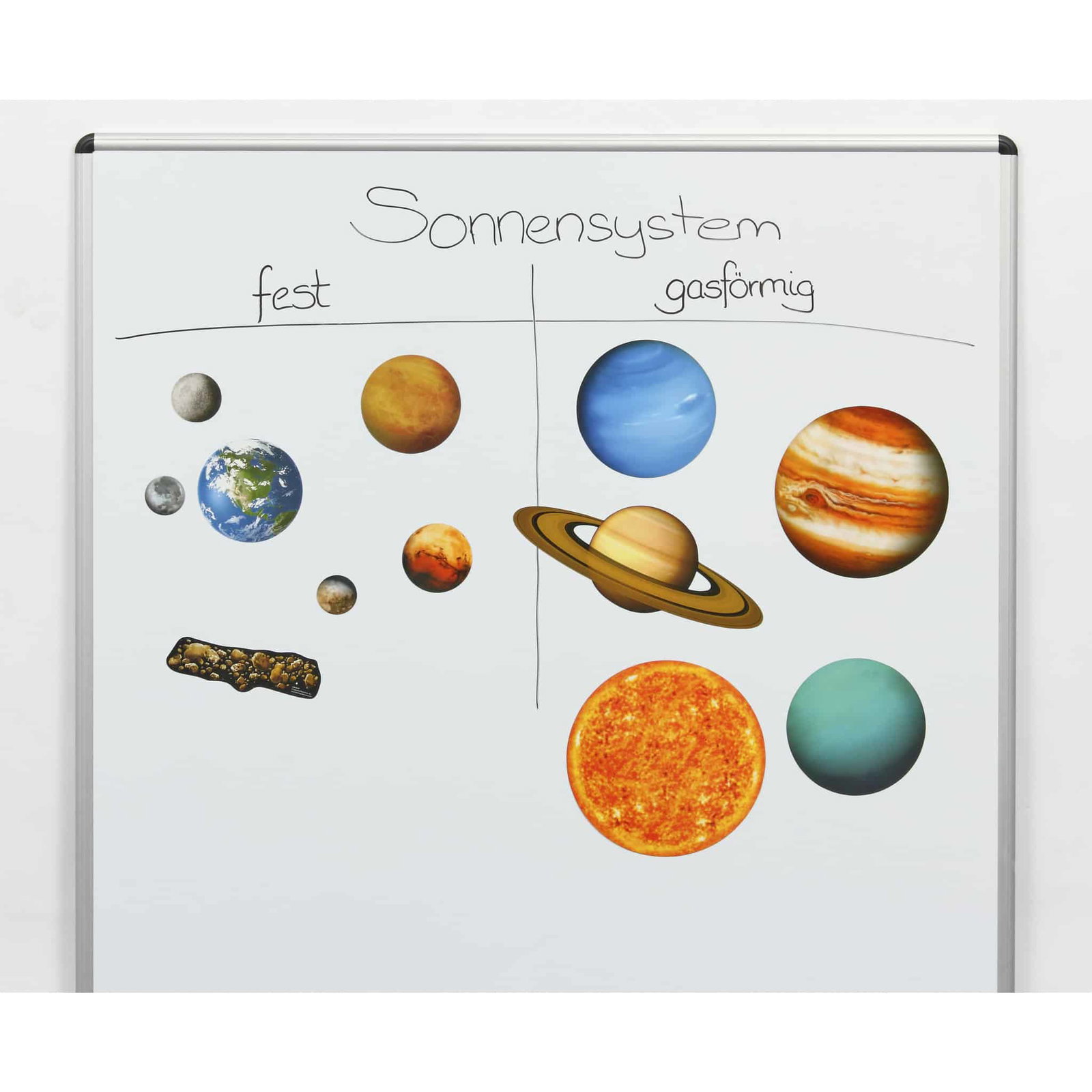 - Das komplette Sonnensystem darstellen: Für eine visuelle Darstellung des gesamten Sonnensystems können die Teile leicht an magnetischen Oberflächen, wie z.B. der Tafel, angebracht werden.