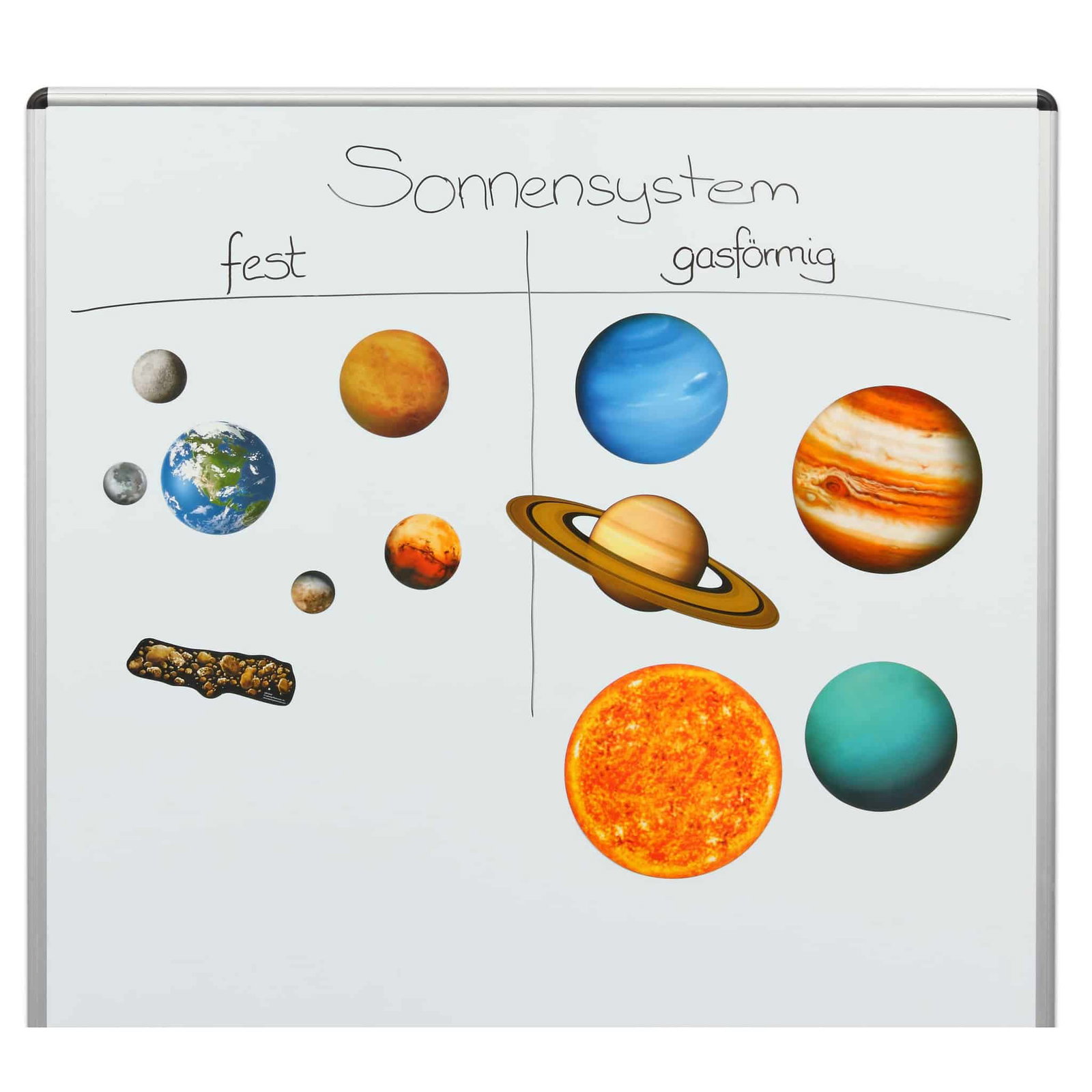 - Planeten nach Eigenschaften einteilen: Die Kinder lernen, welche Planeten fest oder gasförmig sind und können diese Informationen praktisch an der Tafel umsetzen.
