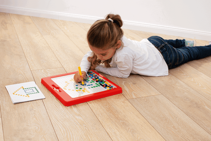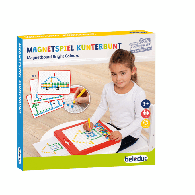 Mit dem Magnetspiel Kunterbunt können Kinder volle Kreativität erleben! Die 10 beidseitig bedruckten Vorlagekarten geben Anregungen und Inspirationen, um tolle Bilder von Tieren, Autos und vielen anderen Motiven zu erstellen. Die bunten Steine haften schnell am magnetischen Stift und ziehen die Metallkugeln, wodurch die Kinder sie einfach in die Vertiefungen legen können. Dies fördert nicht nur die Hand-Augen-Koordination, sondern schult auch die Feinmotorik.