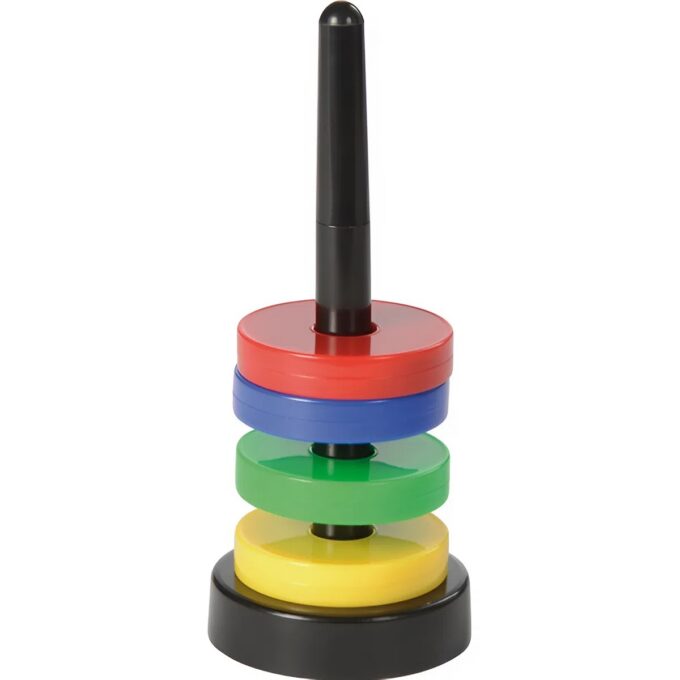 - Geschicktes Hantieren: Das Aufstecken der Ringe auf den Stab erfordert eine ruhige Hand und trainiert die Feinmotorik sowie die Hand-Auge-Koordination.