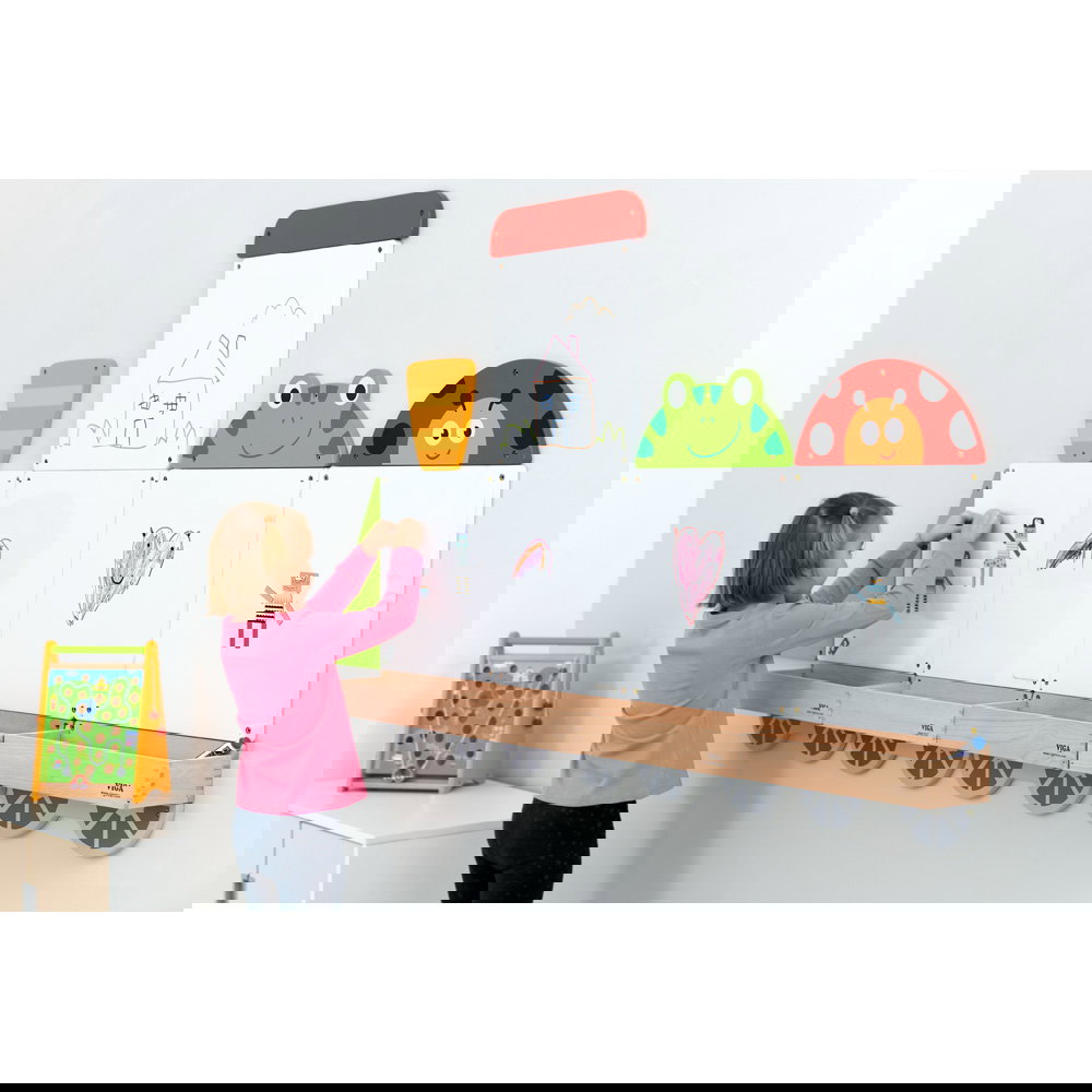 Jede der fünf Tafeln ist eine leere Leinwand, die darauf wartet, mit den Ideen der Kinder gefüllt zu werden. Ob bunte Zeichnungen, erste Schreibversuche oder das Anbringen von Magnetbuchstaben und -figuren – die glatte Whiteboard-Oberfläche kann immer wieder neu gestaltet werden. Dies fördert nicht nur die Feinmotorik, sondern auch die Kreativität und den visuellen Ausdruck. - Unterstützt soziales Miteinander