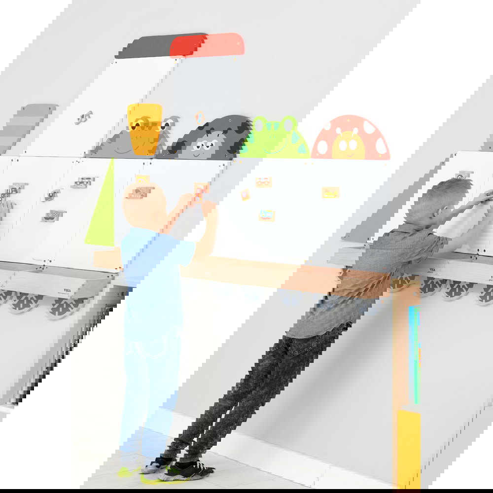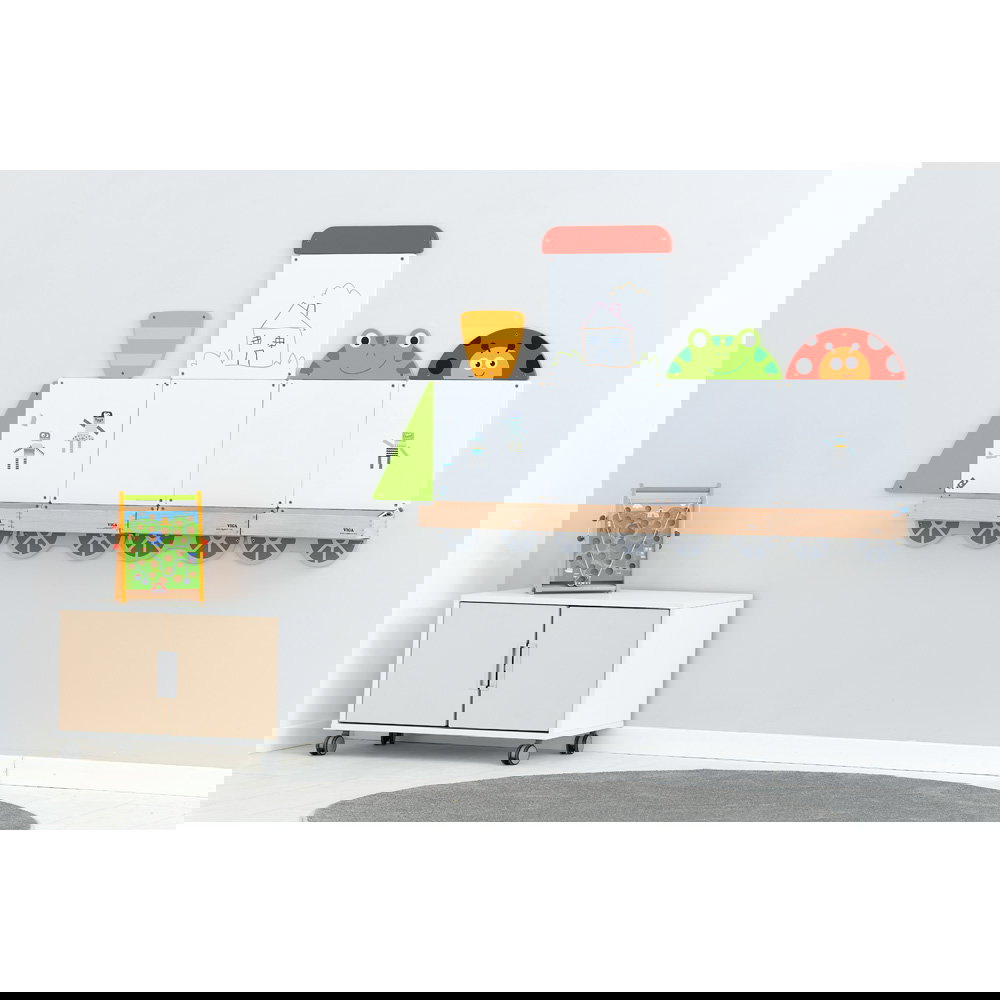 Die Kombination aus beschreib- und abwischbaren Magnet-Whiteboards und farbenfrohen Applikationen aus MDF-Platte macht dieses Set zu einem sofortigen Blickfang. Es lädt Kinder dazu ein, ihrer Kreativität freien Lauf zu lassen, zu malen, zu schreiben und mit Magneten zu spielen. Da das Set aus einzelnen Modulen besteht, bietet es genügend Platz für mehrere kleine Künstler, die gleichzeitig die Welt der Züge und des Malens entdecken können. Praktische Stiftablagen sorgen dabei stets für Ordnung.