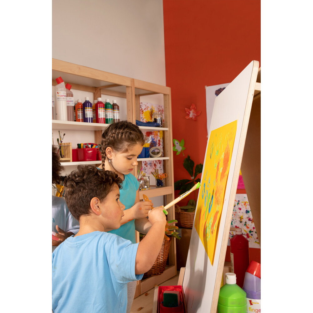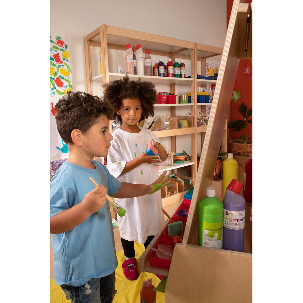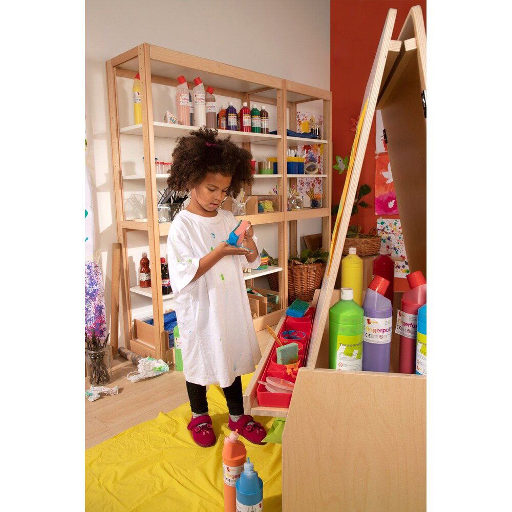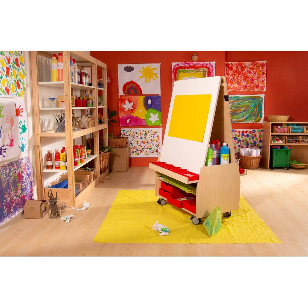 Alles hat seinen Platz: Die seitlichen Auszüge dienen als praktische Ablageflächen für Stifte, Pinsel und Farben. Die beiden mitgelieferten roten Kunststoffwannen fangen Farbtropfen auf und sind kinderleicht zu reinigen. In den Regalfächern darunter finden weitere Materialkisten oder Papierblöcke Platz. Sind die Auszüge eingeschoben, können die Wannen unten verstaut werden. - Kindgerecht, sicher und langlebig