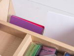 Mal- und Bastelwagen mit Rollen – Rahmen aus 18 mm starker Ahornspanplatte. Kanten mit 2 mm ABS gesichert. Seitenregale aus Plexiglas zur Aufbewahrung von Kartons und Papier. Hochwertige Räder.