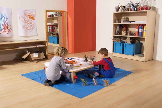Design und Sicherheit: Das Mal- und Kreativpodest besticht durch seine kindgerechte und ansprechende Gestaltung. Die intuitive Form und die kindgerechte Höhe sorgen dafür, dass die jungen Künstler bequem arbeiten können, während die Stufe gleichzeitig verhindert, dass andere Kinder über ihre Kunstwerke laufen. Die glatte, leicht zu reinigende Oberfläche garantiert eine einfache Pflege.