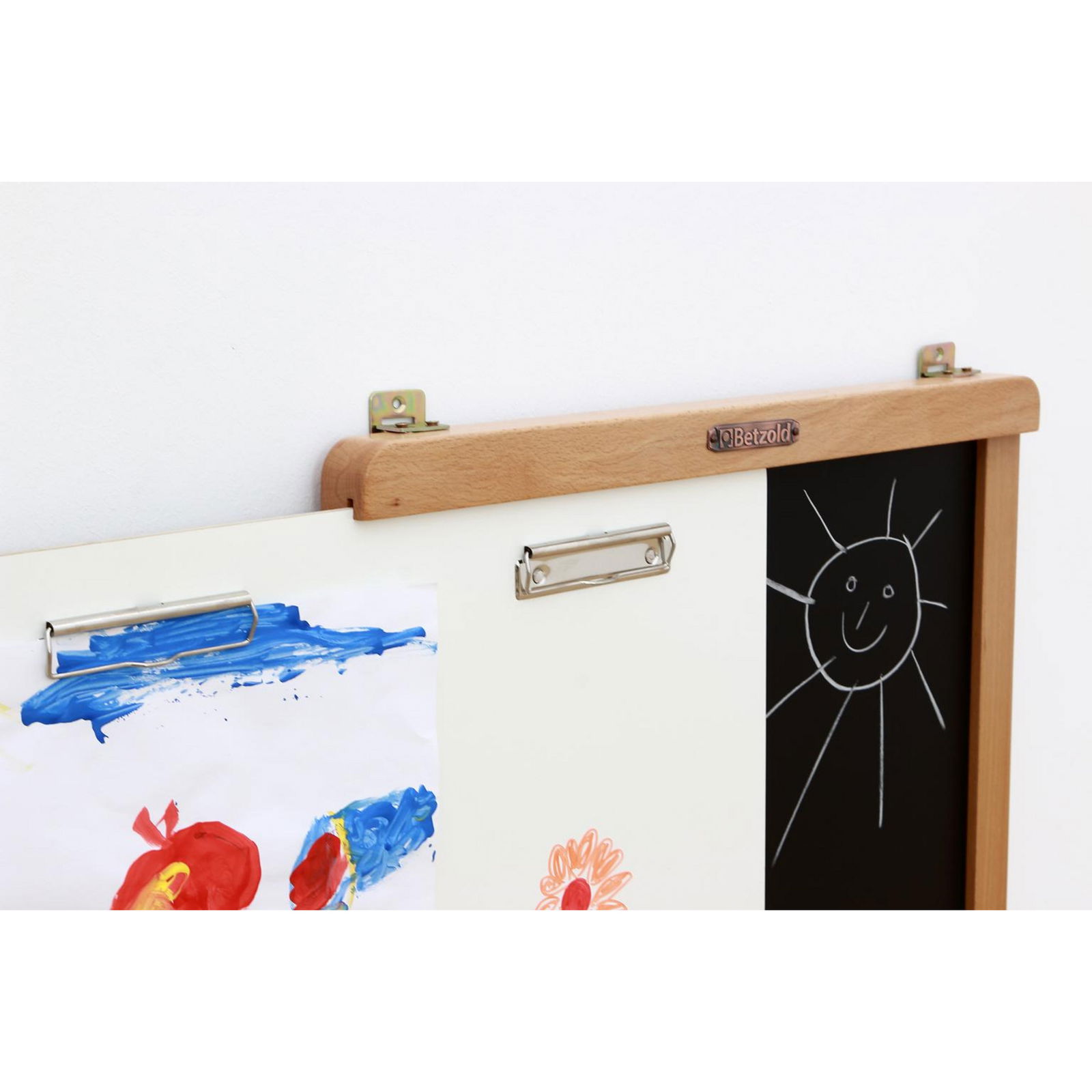 Die Malwand ist die ideale Lösung für kleinere Räume, da sie keinen wertvollen Bodenplatz beansprucht. Sie wird einfach mit den mitgelieferten Metall-Aufhängungen an der Wand befestigt und kann bei Bedarf jederzeit wieder abgenommen werden. So bleibt der Raum flexibel nutzbar für andere Spielaktivitäten. - Praktisches und durchdachtes Zubehör