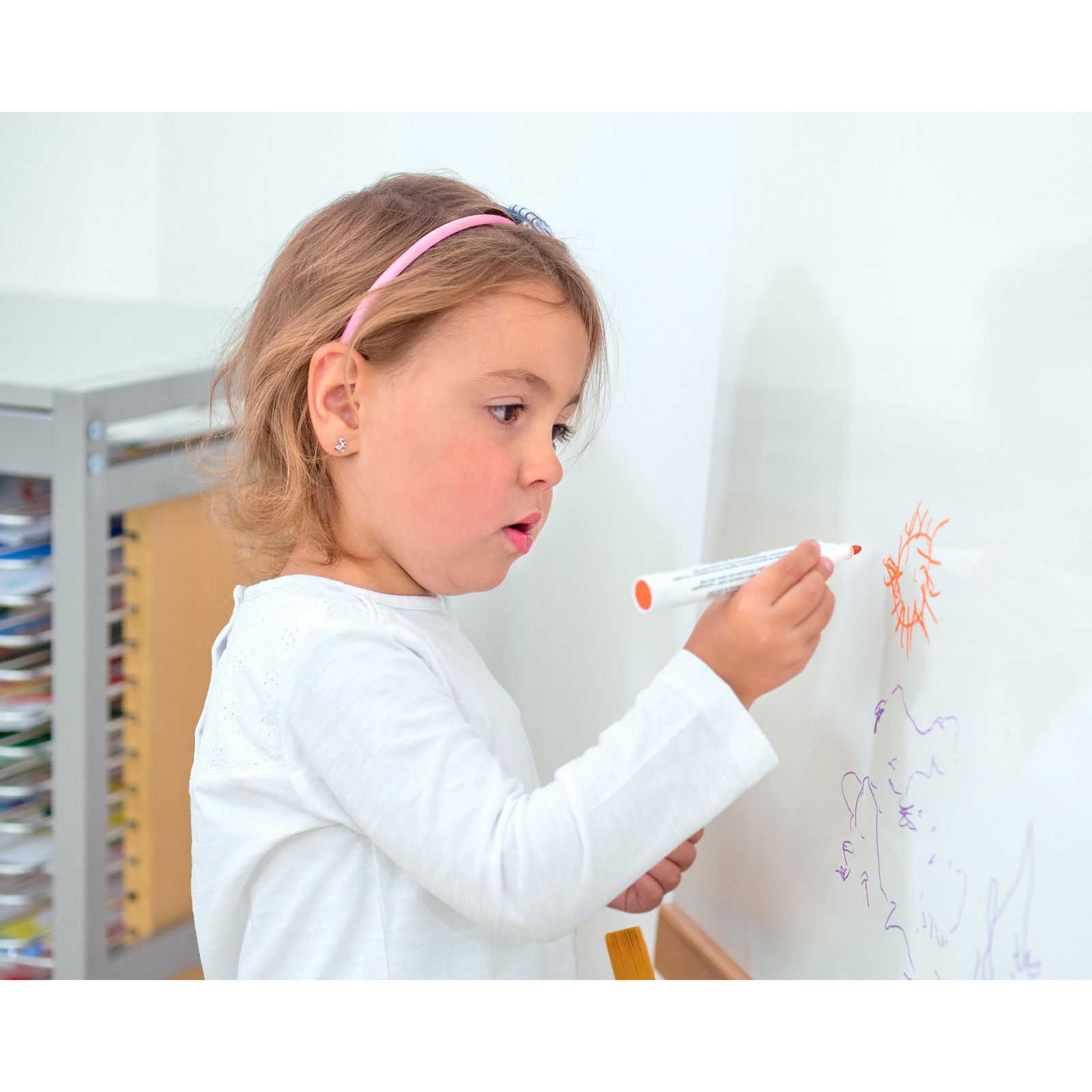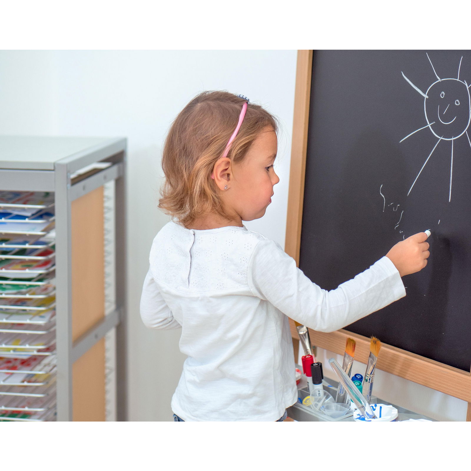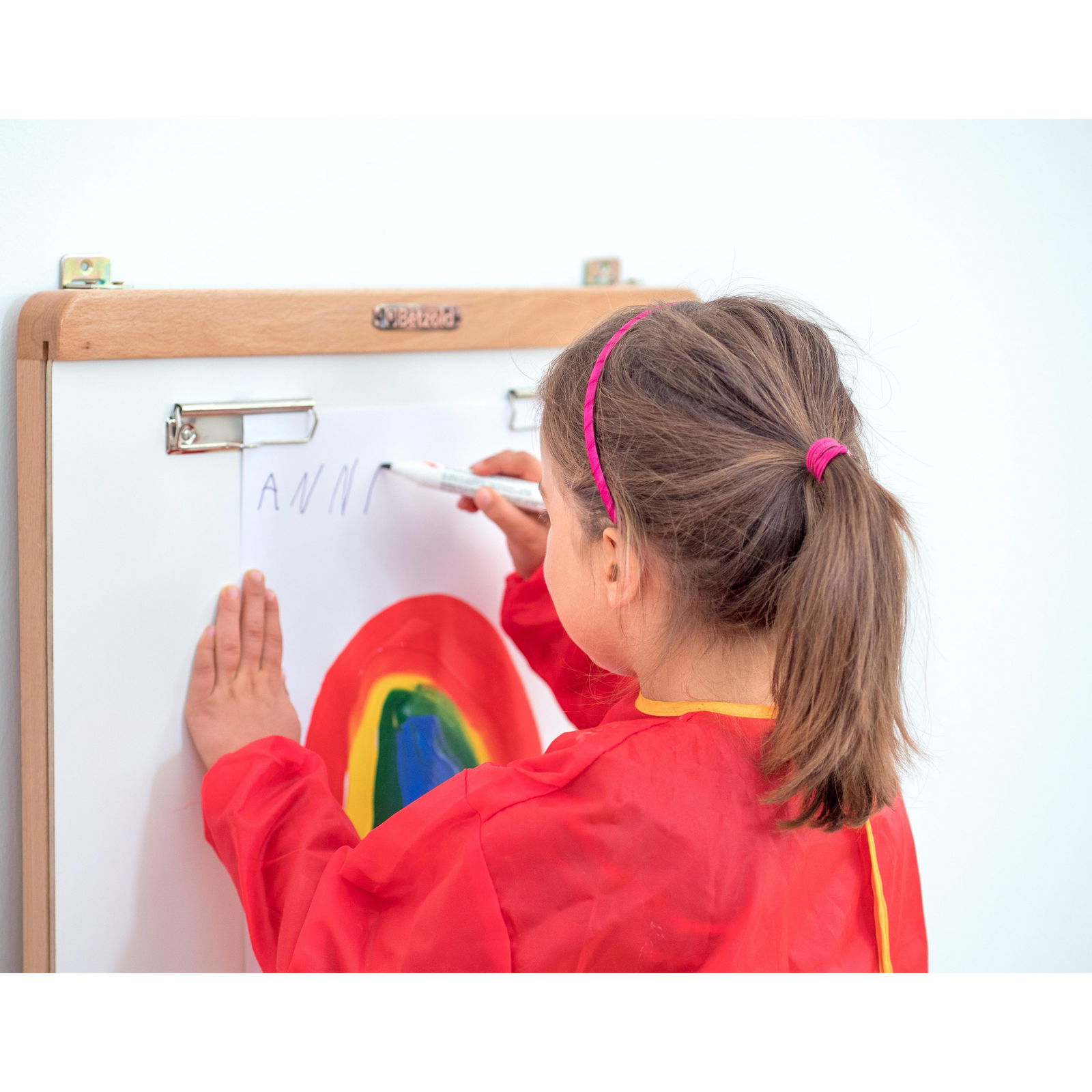 Die Whiteboard-Tafel kann dank einer praktischen Schiebleiste mühelos aus dem Holzrahmen genommen werden. Dies erleichtert nicht nur die gründliche Reinigung, sondern auch das Anbringen von neuem Papier. Die kindgerechte Arbeitshöhe mit einer Unterkante bei 55 cm ist ideal für Kinder im Vorschul- und Grundschulalter. - Einfache Installation