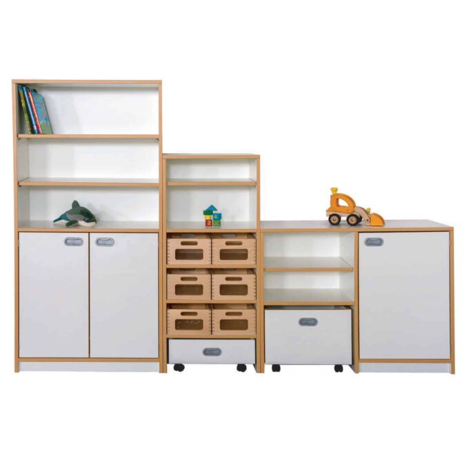 - Mobile Spielkisten: Das System umfasst zwei praktische Rollkästen in unterschiedlichen Höhen – einen hohen für große Bausteine oder Kostüme und einen flachen für Bücher oder Puzzles. Diese können von den Kindern mühelos dorthin geschoben werden, wo das Spiel gerade stattfindet. Das Aufräumen wird so zu einem aktiven und einfachen Teil des Spiels.