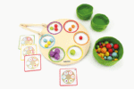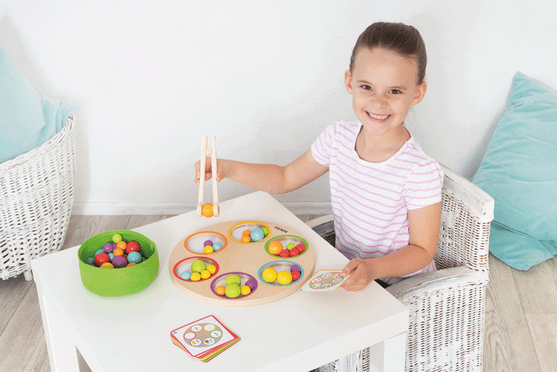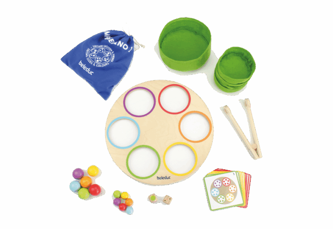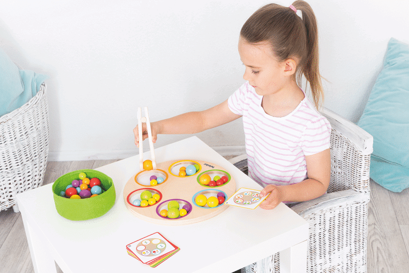 Das Spiel besteht aus 68 Teilen, darunter 10 Aufgabenkarten, die in drei Schwierigkeitsstufen unterteilt sind. So können die Kinder je nach ihrem individuellen Fortschritt spielen und lernen. Die bunten Kugeln kommen in zwei verschiedenen Größen, was das Sortieren zu einer spannenden Herausforderung macht! Mit einer praktischen Zange, die für beide Größen geeignet ist, üben die Kinder ihre Fingerfertigkeit, während sie die Kugeln in die entsprechenden Vertiefungen legen.