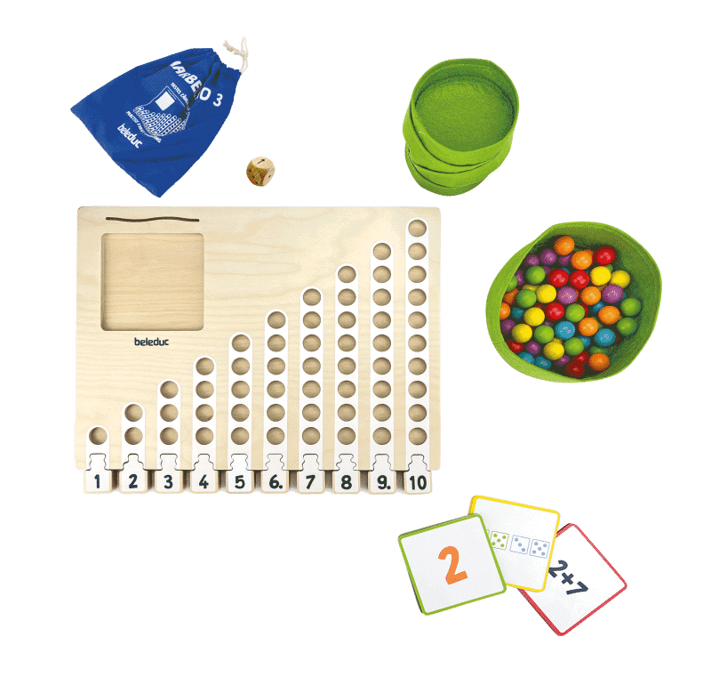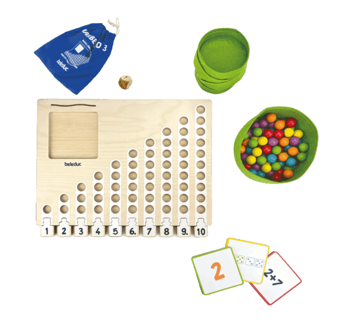 Das Set enthält zudem einen Würfel, mehrere kleine Körbe aus Filz und einen großen Korb zur Aufbewahrung – ideal, um die Holzkugeln und zur Entwicklung des Zählens zu nutzen.