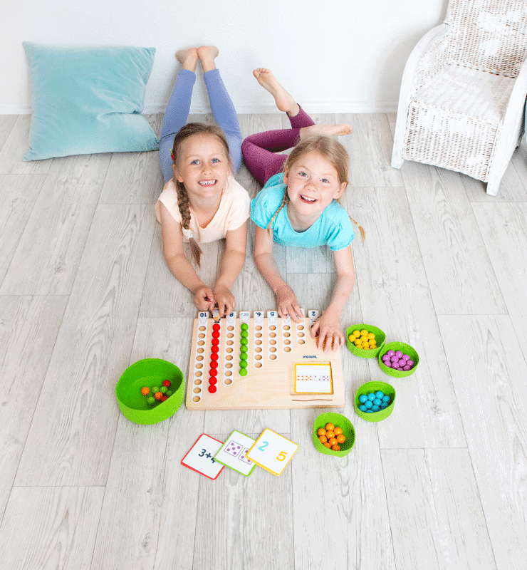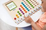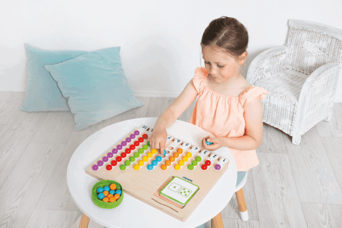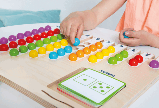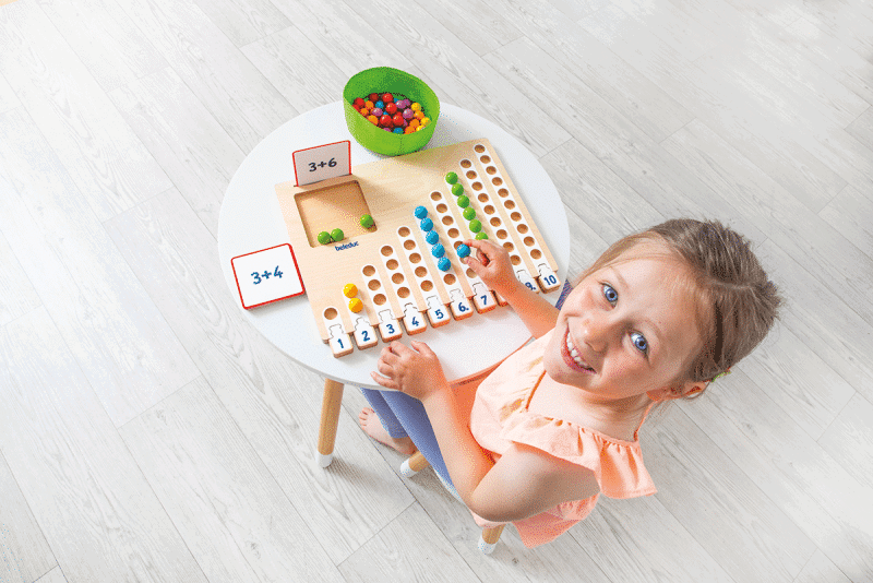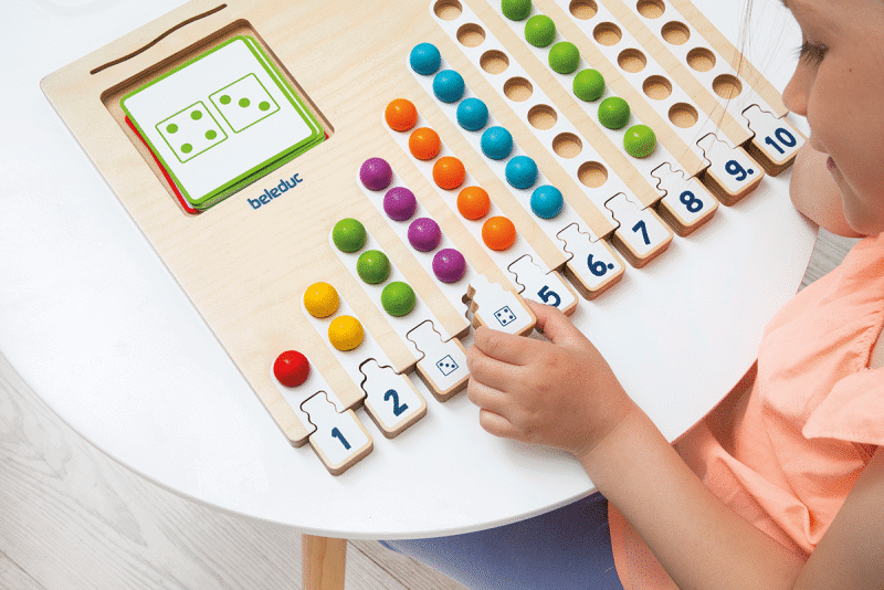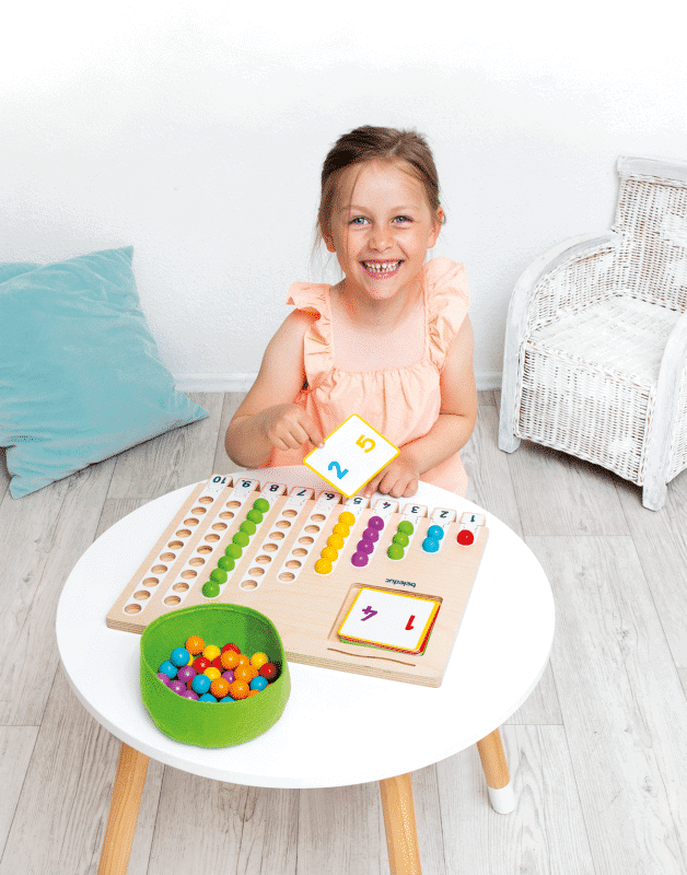 Im Marbelino 3 „Counting“ Set finden die Kinder 66 bunte Holzkugeln, die sie auf das Sortierbrett legen. Durch die 21 beidseitig bedruckten Aufgabenkarten, die in unterschiedlichen Schwierigkeitsstufen angeboten werden, können die Kleinen ihre mathematischen Fähigkeiten entsprechend ihrem Wissensstand festigen und erweitern. Die Puzzleteile ermöglichen den Kindern eine Selbstkontrolle, sodass sie jederzeit überprüfen können, ob sie die Aufgaben richtig gelöst haben.