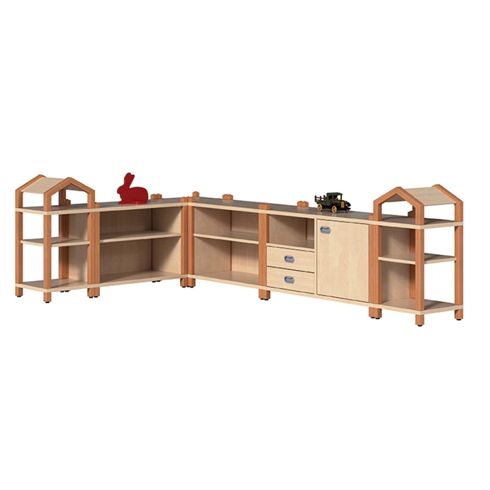 Verwandeln Sie jeden Raum in eine fantasievolle, strukturierte und sichere Umgebung mit dem MARISSA Regalsystem. Dieses bezaubernde Arrangement aus sechs Elementen wurde speziell entwickelt, um Ecken optimal zu nutzen und gleichzeitig eine offene, einladende Atmosphäre zu schaffen. Mit einer cleveren Mischung aus offenen Regalen, geschlossenem Stauraum und dekorativen Schubladen bietet MARISSA vielfältige Organisationsmöglichkeiten. Die verspielten Ecktürmchen mit ihren Dachaufsätzen verleihen dem Ganzen einen einzigartigen, burgähnlichen Charakter, der Kinder zum Aufräumen und Spielen inspiriert. Basierend auf dem robusten Stollensystem aus massivem Buchenholz und ausgestattet mit TÜV- und GS-Zertifikaten, steht MARISSA für höchste Qualität, Langlebigkeit und geprüfte Sicherheit – die ideale Wahl für Kindergärten, Spielgruppen und jedes anspruchsvolle Kinderzimmer.