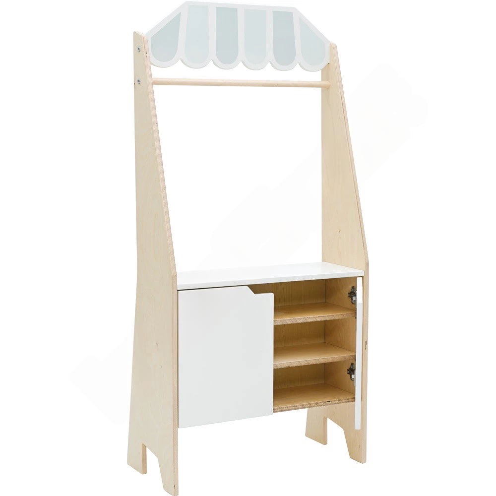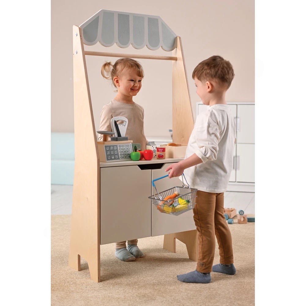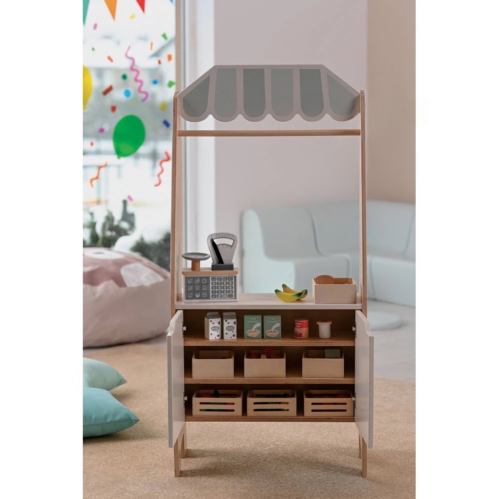 Chaos im Kinderzimmer? Nicht hiermit. Der integrierte Schrank auf der Rückseite bietet genügend Stauraum für Kaufladenzubehör, Handpuppen oder Requisiten. So lernen die Kinder, ihre Spielsachen nach dem Spielen eigenständig aufzuräumen und zu organisieren. - Umweltschonende und gesunde Materialien