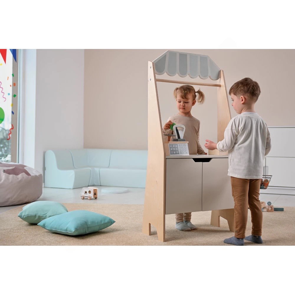 Warum zwei Möbelstücke kaufen, wenn eines reicht? Dieses Modell lässt sich im Handumdrehen umfunktionieren. Heute dient es als Kiosk oder Marktstand, an dem Verkaufsgespräche geübt werden, und morgen wird es zur Bühne für spannende Theateraufführungen. Diese Vielseitigkeit spart Platz und sorgt dafür, dass das Spielzeug lange interessant bleibt. - Interaktive Kommunikation und Magnettafel