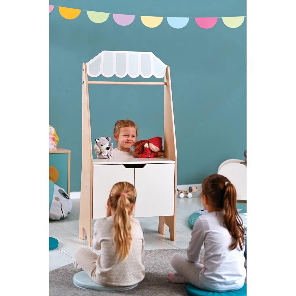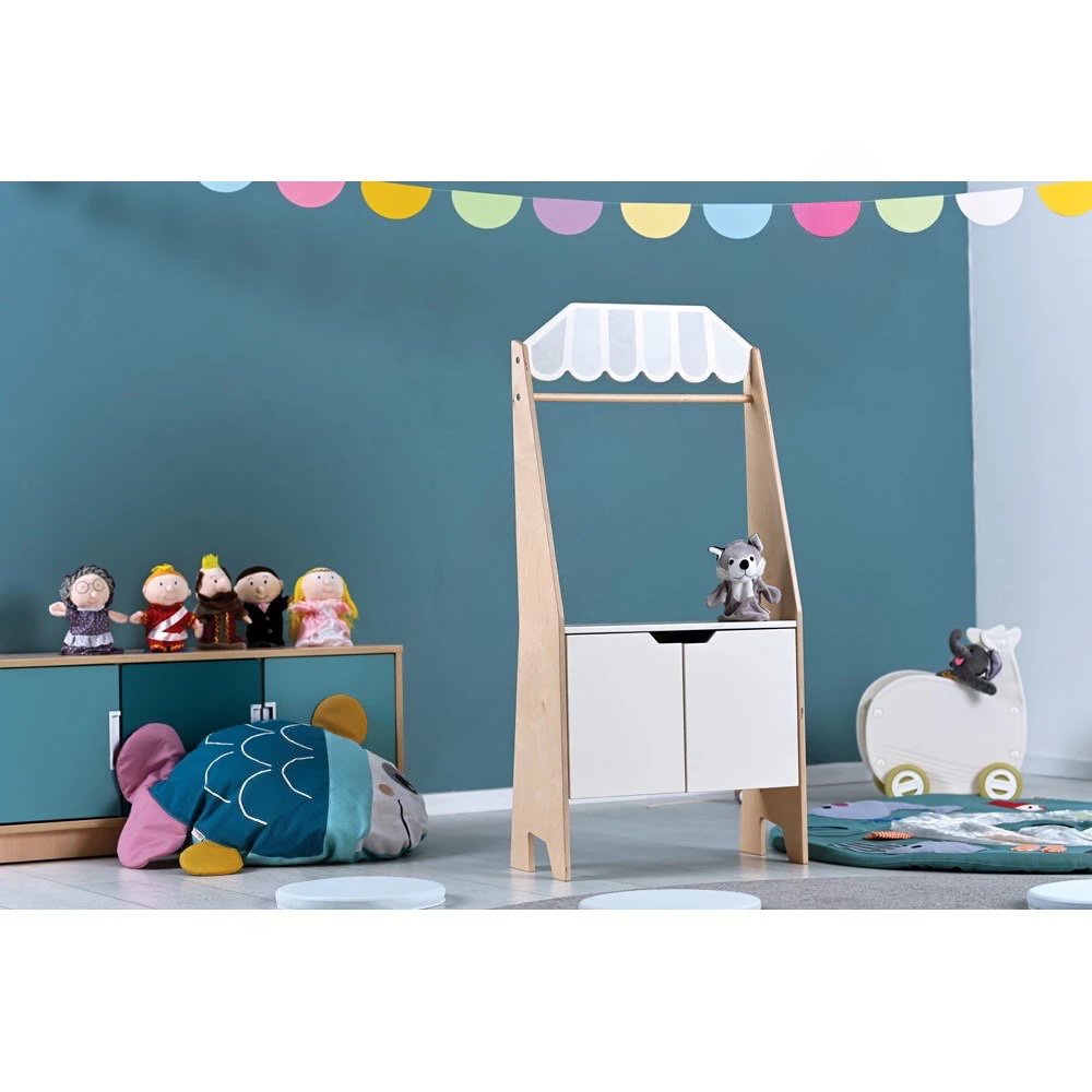 Kinder lieben es, in andere Rollen zu schlüpfen. Mal sind sie geschäftige Marktverkäufer, die lautstark frisches Obst anpreisen, mal sind sie fantasievolle Geschichtenerzähler, die ein gebanntes Publikum mit Puppenspielen verzaubern. Mit dem Marktstand/Puppentheater müssen Sie sich nicht mehr zwischen diesen Spielwelten entscheiden. Dieses clevere 2-in-1-Möbelstück vereint beides in einem kompakten, platzsparenden Design und wird so zum Herzstück in jedem Kinderzimmer, Kindergarten oder Hort.