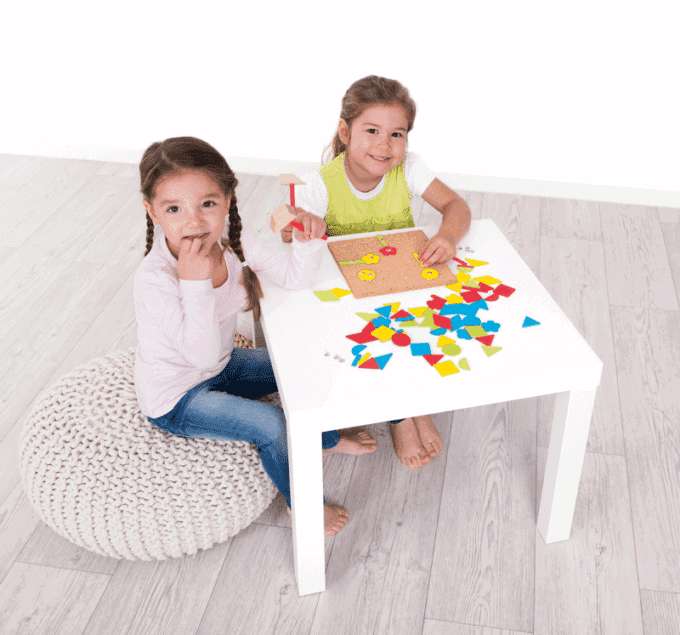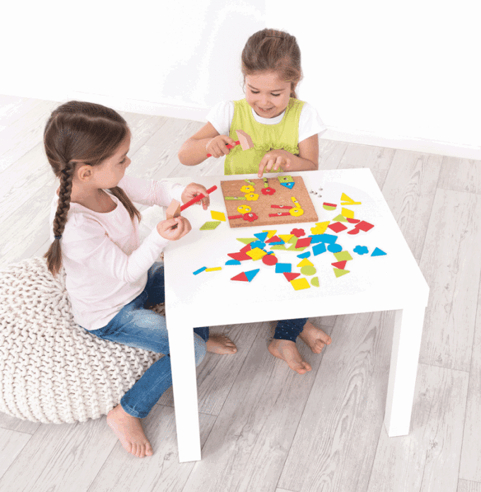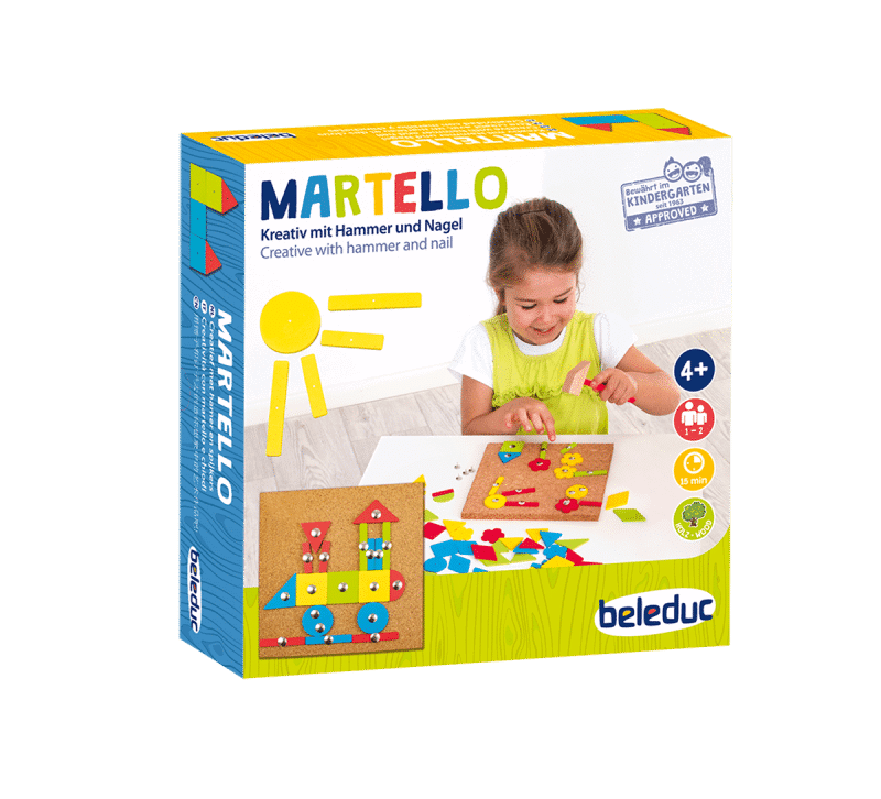 Schnappt euch den Hammer und die Nägel und los geht’s! Mit Martello können die kleinen Künstler ihre ganz eigenen Bilder auf den Korkplatten gestalten. Die Kinder lernen spielerisch, wie sie Formen, Muster und kreative Motive nageln. Dank der stabilen Korkplatte ist das Nageln kinderleicht und sicher.