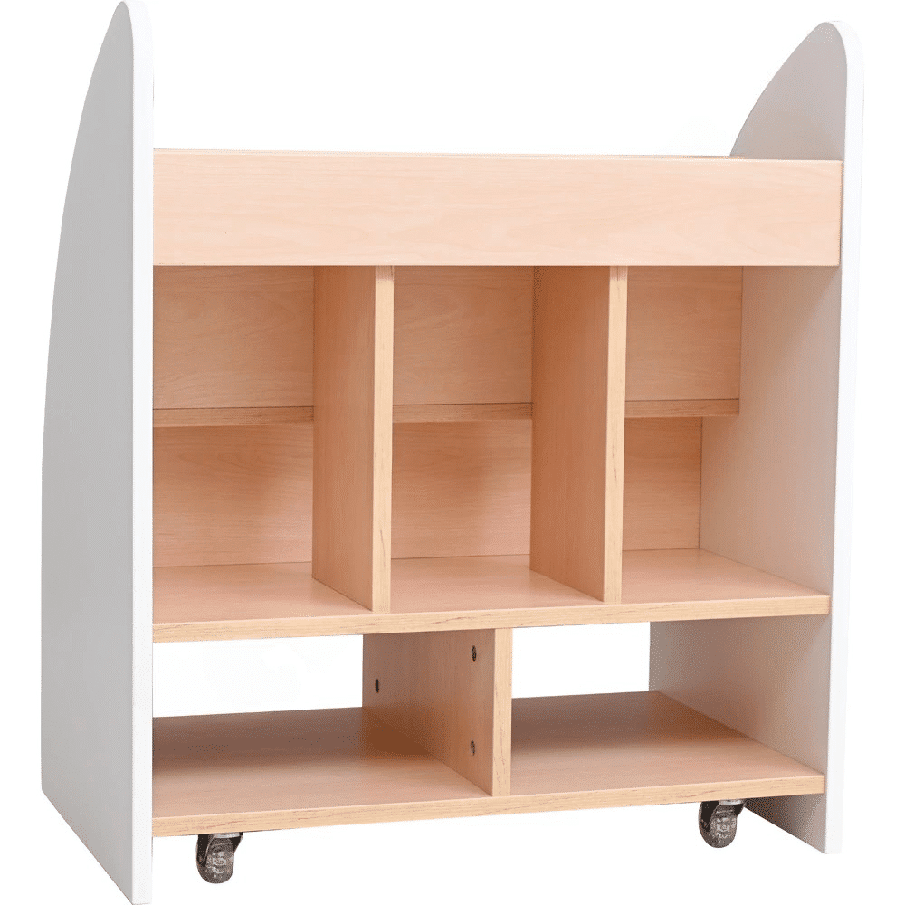 - Einladendes Design: Mit seinem eleganten Ahorndekor und den weißen Seitenwänden fügt sich das Regal harmonisch in jedes Klassenzimmer oder Spielzimmer ein und sorgt für eine freundliche Atmosphäre.