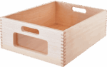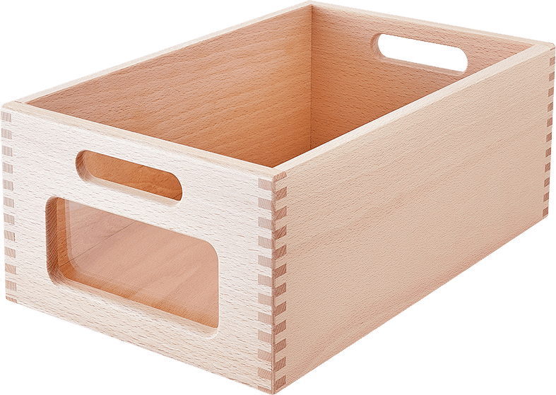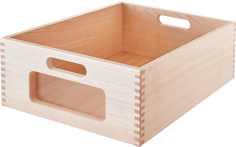 Die Massivholzkästen verfügen über eingefräste Grifflöcher für einfaches Handling. Optional sind sie mit oder ohne Sichtfenster aus Acrylglas erhältlich, was Ihnen die Freiheit gibt, die Kästen nach Ihren Bedürfnissen zu gestalten. Zum Schutz der Schrankoberflächen sind unter jedem Kasten Filzstreifen angebracht.