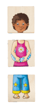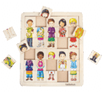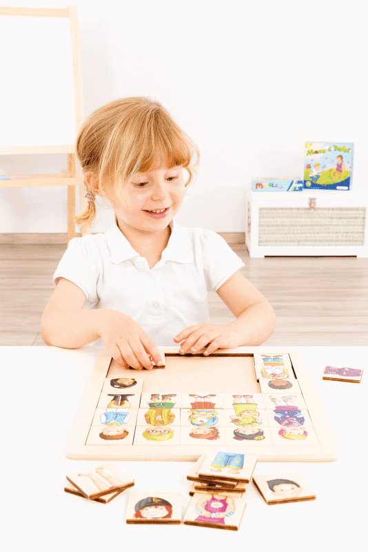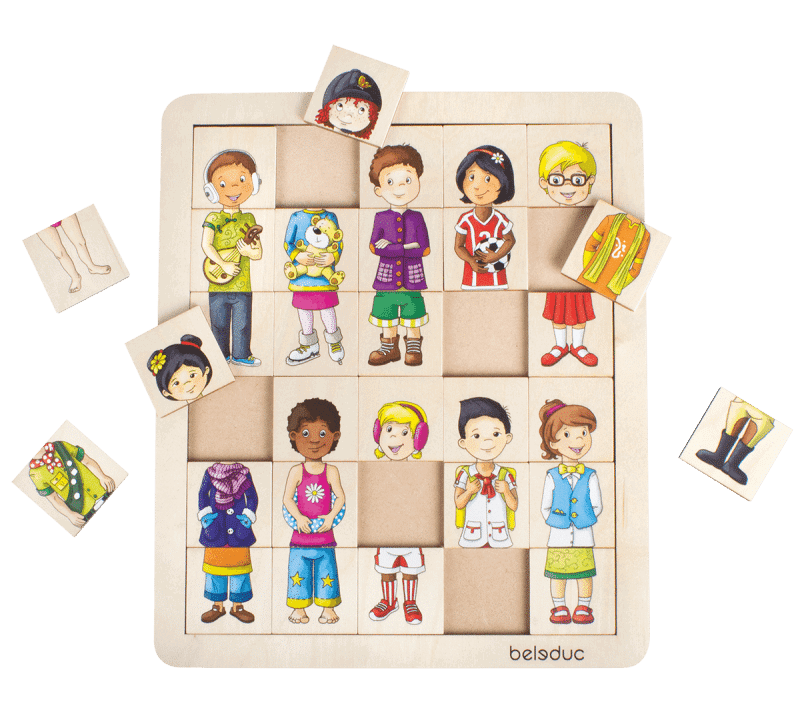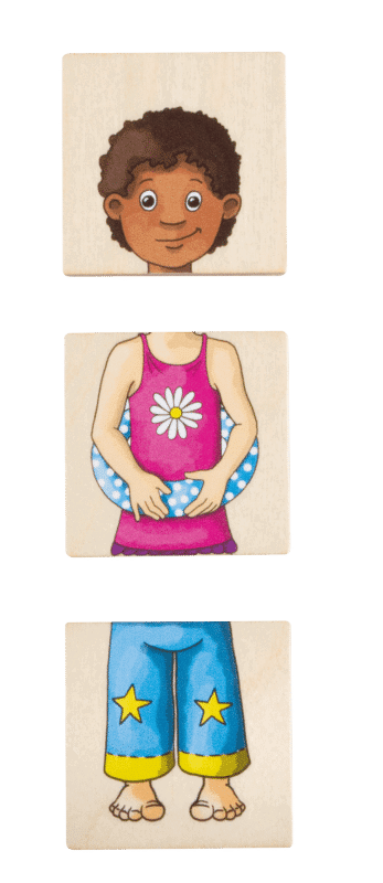 Für Kinder, die ihre Merkfähigkeit unter Beweis stellen möchten, bietet das Spiel außerdem eine Herausforderung im Stil eines Memoryspiels. Sie müssen sich die Positionen der Teile merken, um die richtige dreiteilige Kombination eines Kindes zusammenzufügen.