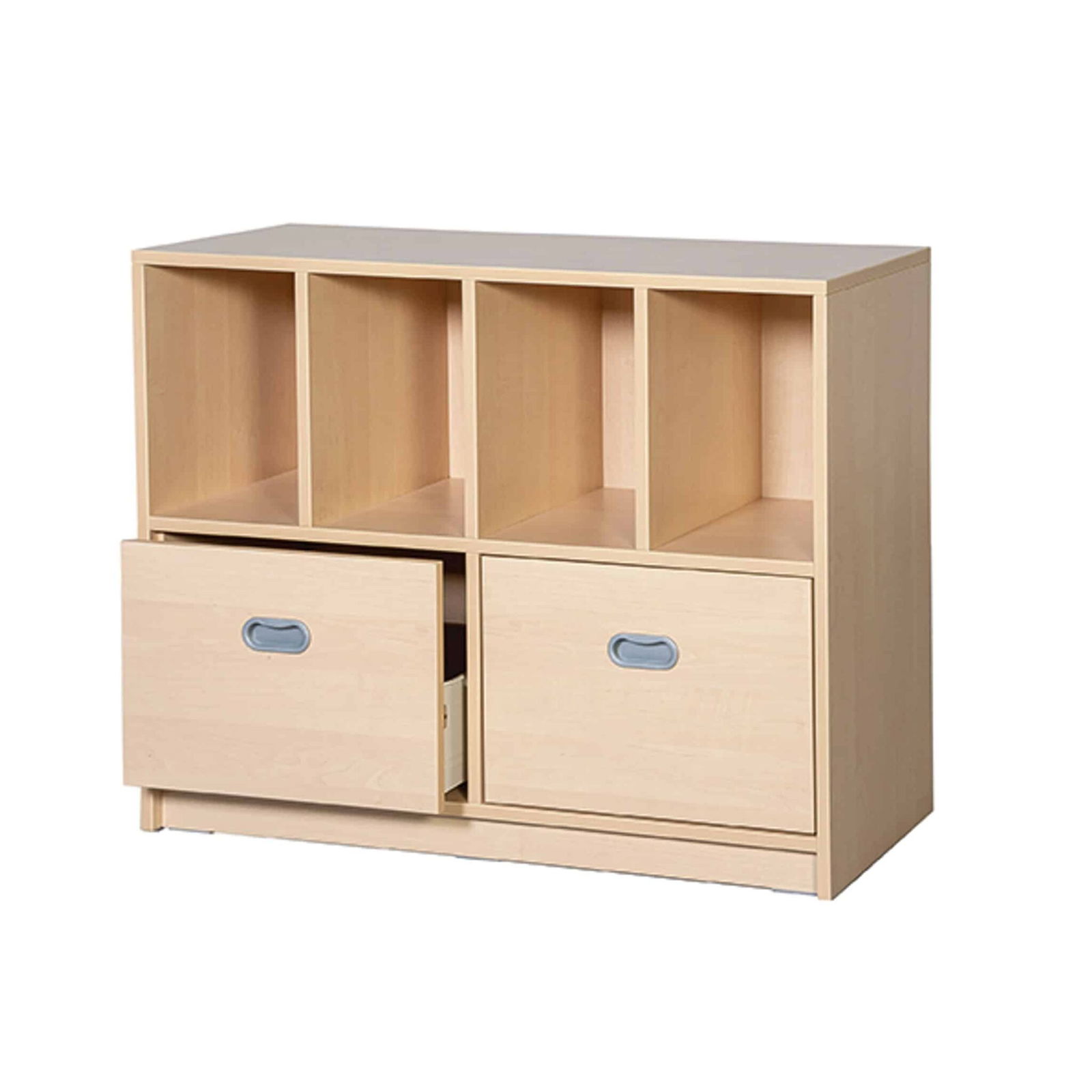 Bringen Sie mühelos Struktur und Klarheit in jeden Raum mit diesem clever konzipierten Materialschrank. Dank seiner kompakten Größe ist er ein echtes Allroundtalent, das selbst in kleineren Ecken für maximale Ordnung sorgt. Die durchdachte Aufteilung aus vier offenen Fächern und zwei hohen, geräumigen Schubladen macht ihn zur idealen Aufbewahrungslösung für Kindertagesstätten, Grundschulen und Horte. Hier finden Bücher, Bastelutensilien und Spielzeuge ihren festen Platz und sind jederzeit griffbereit. Gefertigt aus robusten Materialien und mit kindersicheren Details versehen, verbindet dieser Schrank Funktionalität mit Langlebigkeit und ansprechendem Design.